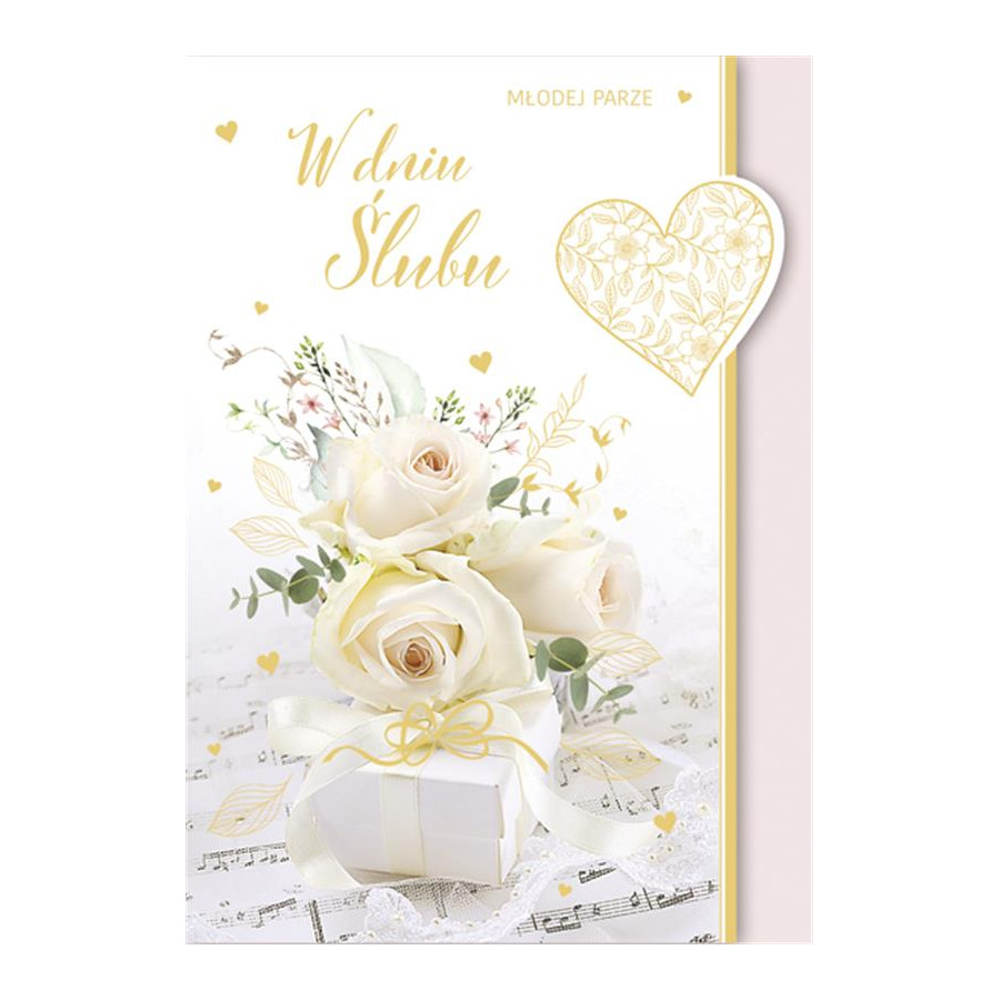 Jeśli szukasz odpowiedniego upominku ślubnego, ta kartka sprawdzi się idealnie! Biały karnet przedstawia jasnożółte róże otoczone delikatnymi listkami, złote serce oraz napis "W dniu Ślubu Młodej Parze". Wewnątrz kartki znajdują się elegancko zapisane życzenia z miejscem na własny dopisek, do zestawu dołączona jest także dopasowana kolorystycznie koperta.
