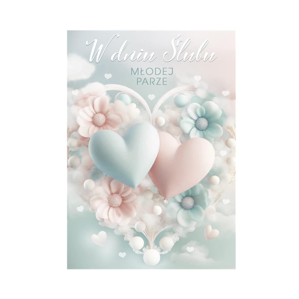 KARTKA ŚLUBNA W DNIU ŚLUBU SERCA KWIATY PASTELOWA BŁĘKITNO-RÓŻOWA 17x12cm