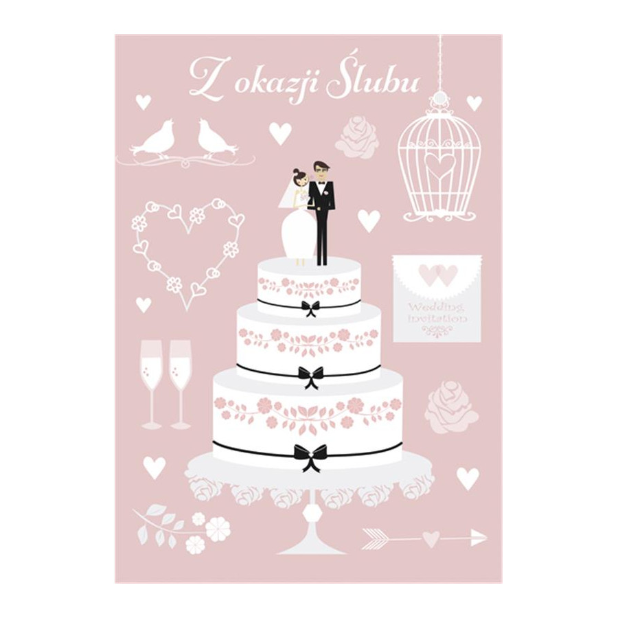 Kartka w kolorze różowym, ozdobiona białym, piętrowym tortem z figurkami Pary Młodej na szczycie oraz eleganckim napisem "Z okazji Ślubu" sprawdzi się doskonale jako ślubny upominek! Wewnątrz kartki znajdują się elegancko zapisane życzenia z miejscem na własny dopisek, do zestawu dołączona jest także dopasowana koperta.