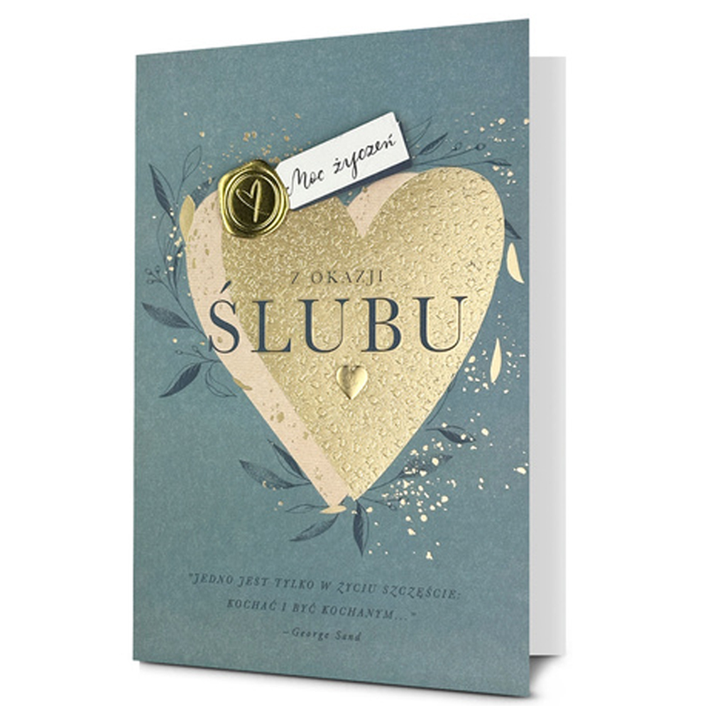 Zbliża się piękny dzień ślubu Twoich bliskich i szukasz odpowiedniego uzupełnienia prezentu ślubnego? Świetnym pomysłem jest kartka z życzeniami, dzięki której wyrazisz całą swoją wielką radość! Karnet w kolorze granatowym ozdobiony dużym złotym sercem otoczonym listkami oraz napisem "Moc życzeń z okazji Ślubu". Wewnątrz kartki znajdują się życzenia z miejscem na własny wpis oraz kolorystycznie dopasowana koperta.