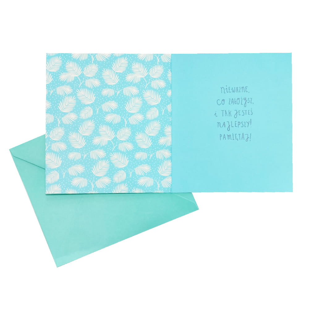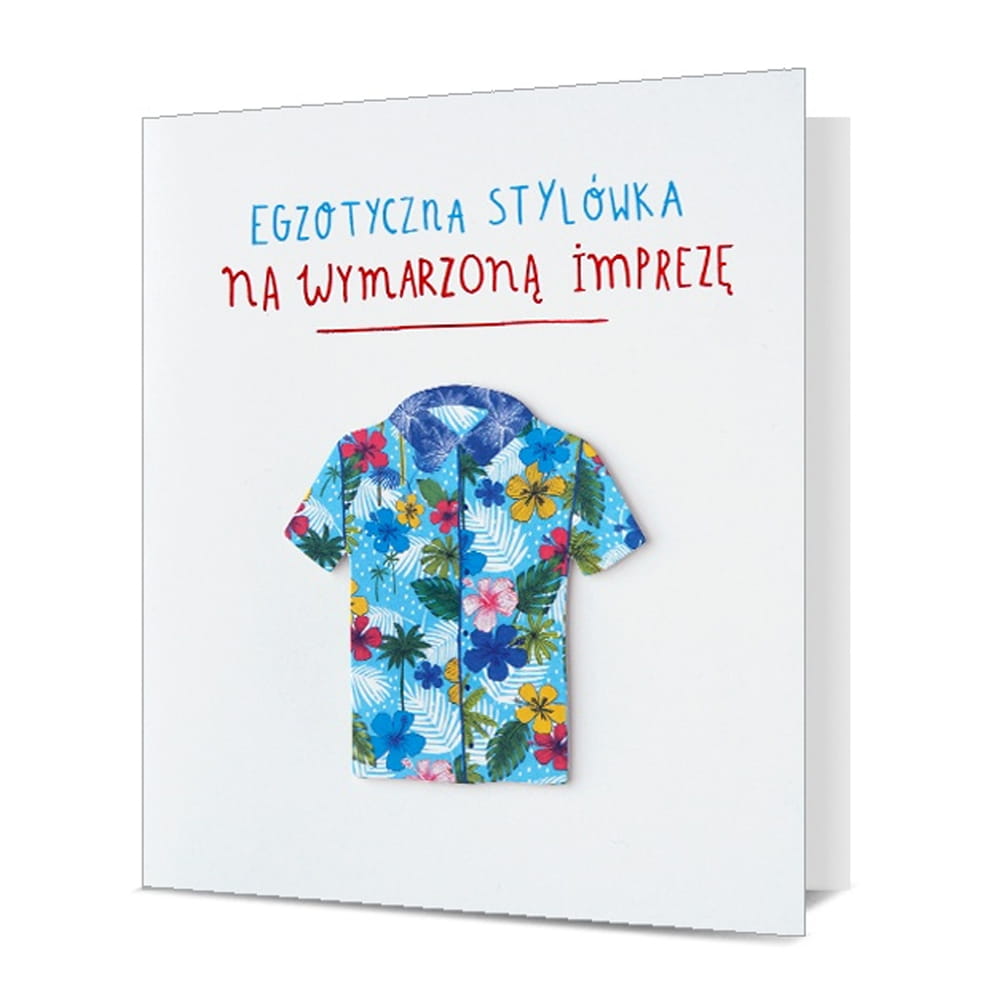 Kartka w kolorze białym ozdobiona letnią, kwiecistą koszulą oraz napisem "Egzotyczna stylówka na wymarzoną imprezę" sprawdzi się idealnie na wiele okazji!
