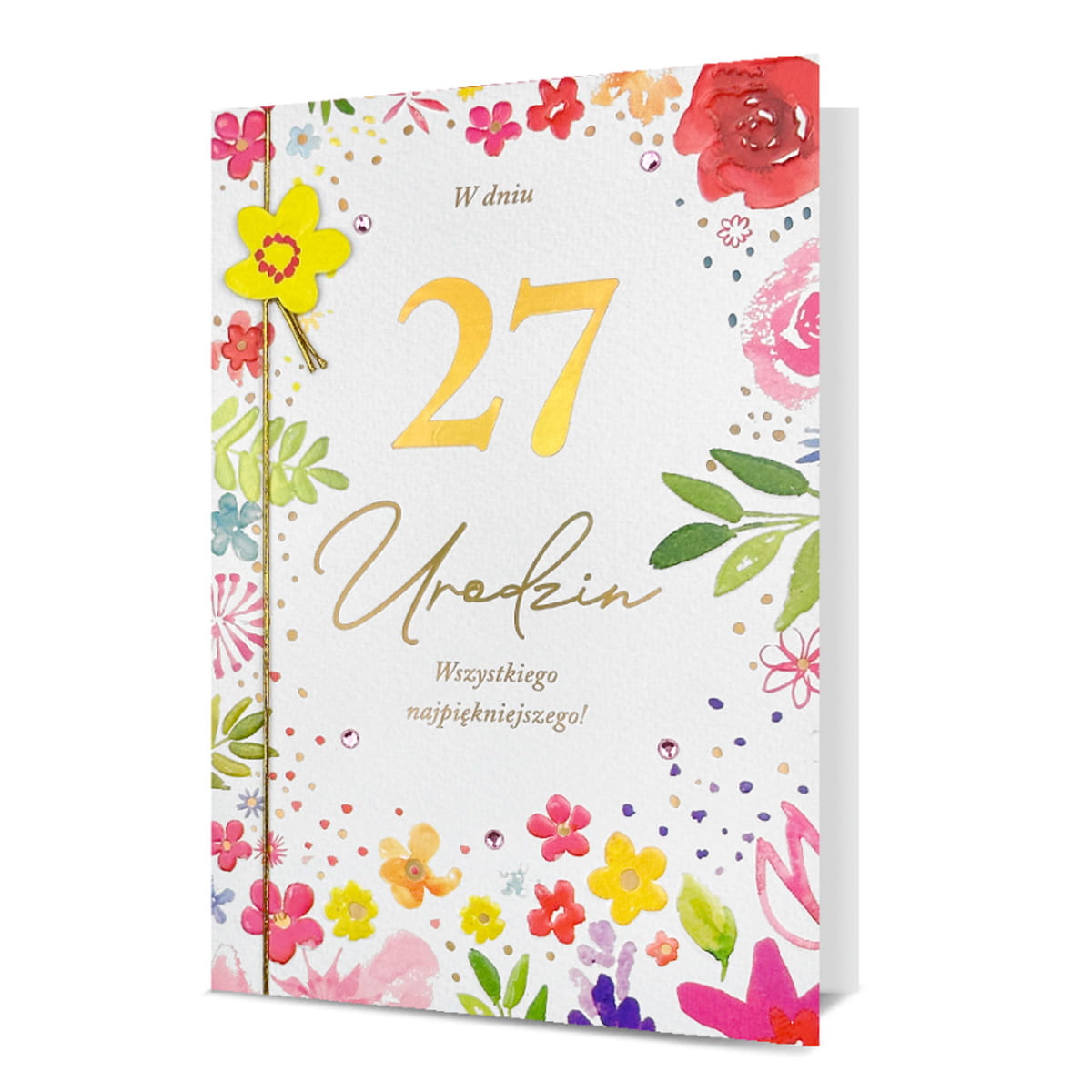 KARTKA URODZINOWA KWIATY NAKLEJKI BIAŁA 19x13cm