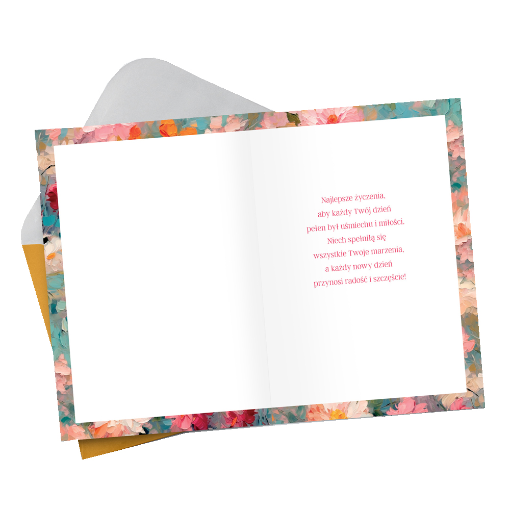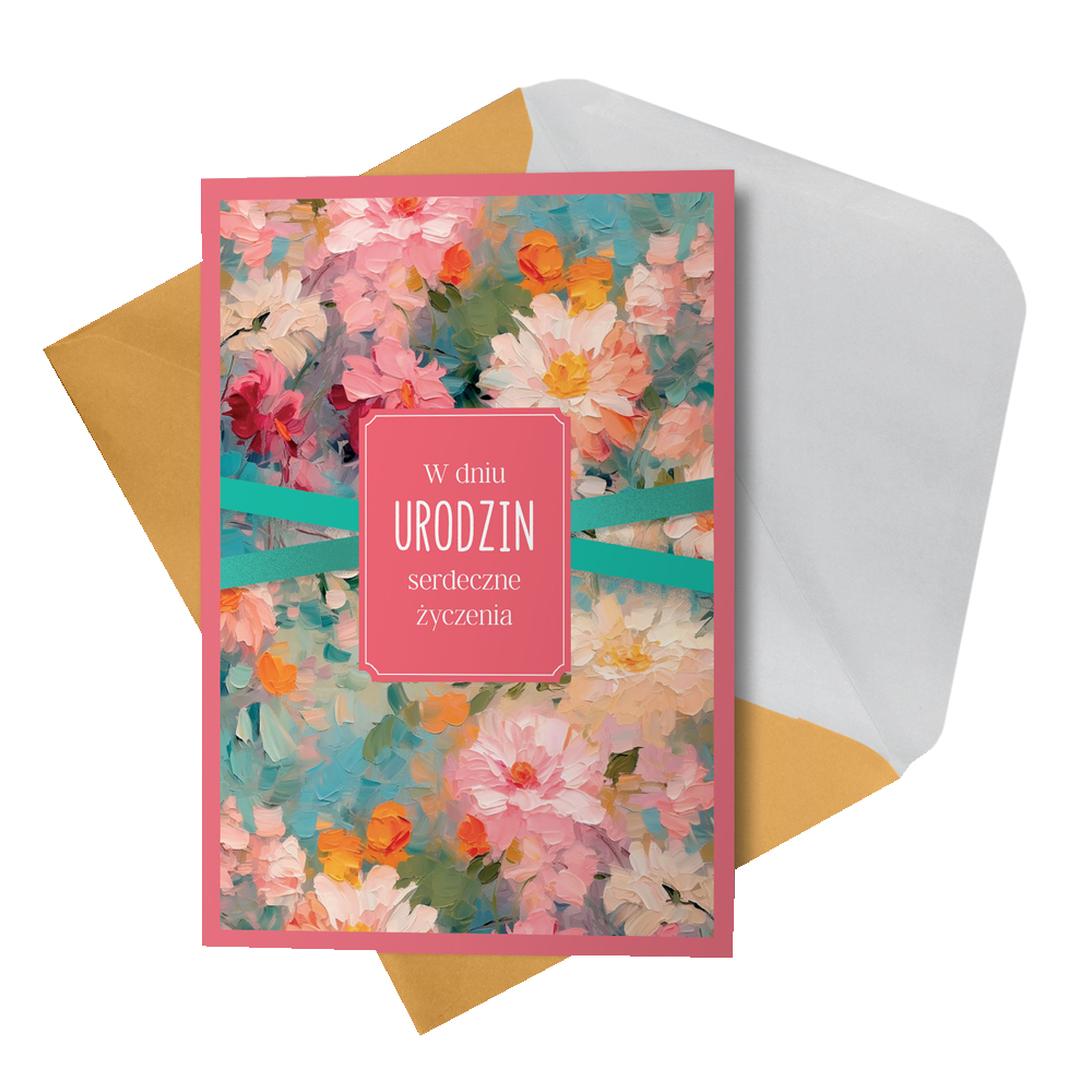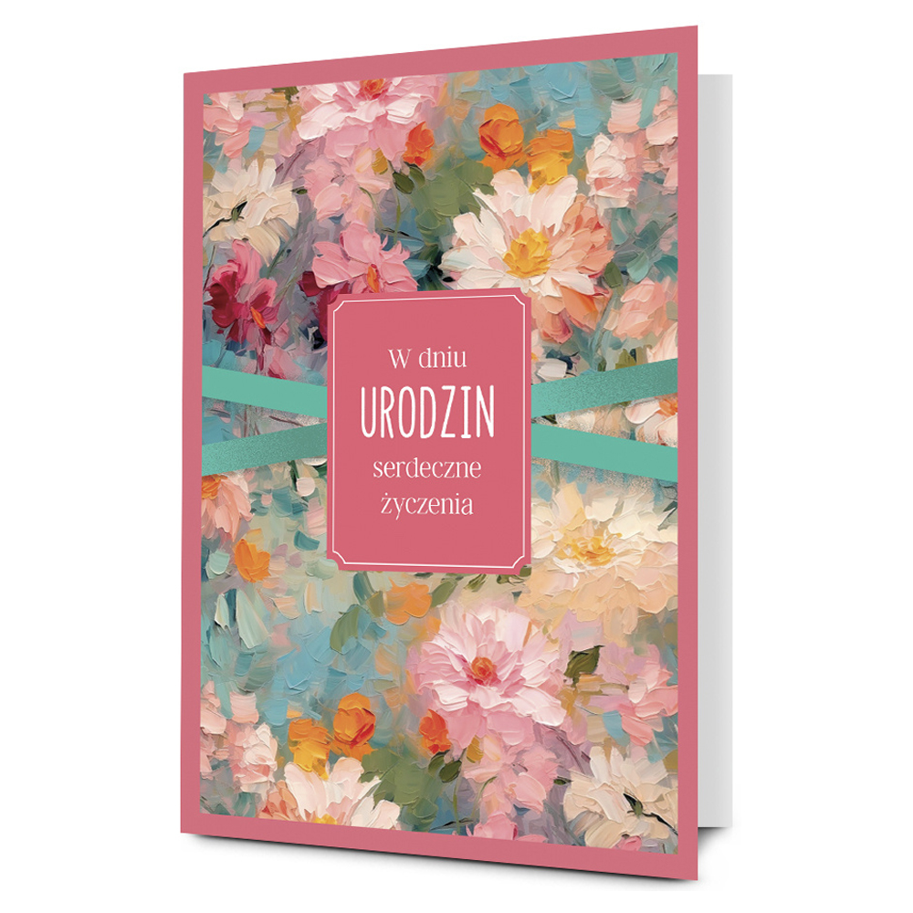 Kartka w kolorze różowo-pastelowym ozdobiona pastelowymi kwiatami, wykończona różową ramką oraz białym napisem "Z okazji Twoich urodzin serdeczne życzenia", Kartka z życzeniami, wraz z miejsce na własną adnotację w środku, oraz dopasowaną kolorystycznie kopertą doskonale się sprawdzi z okazji urodzin!