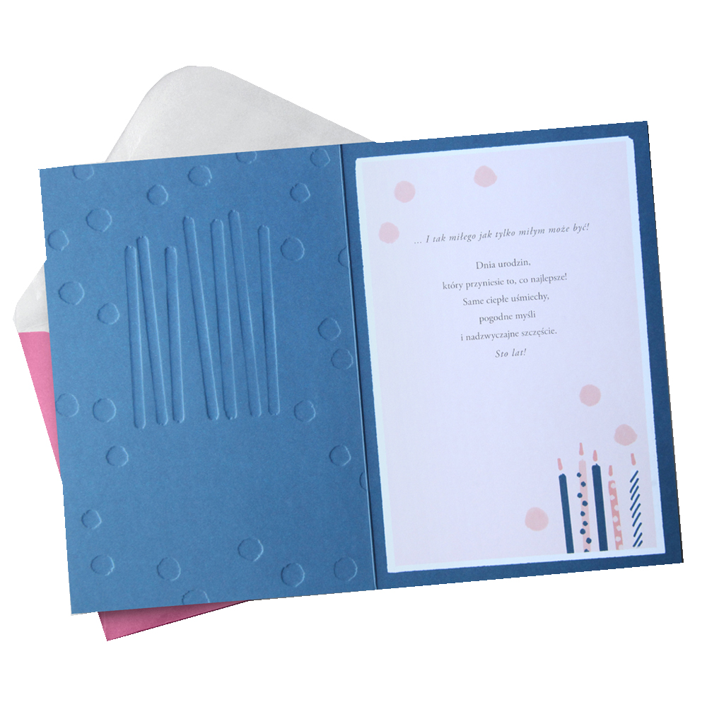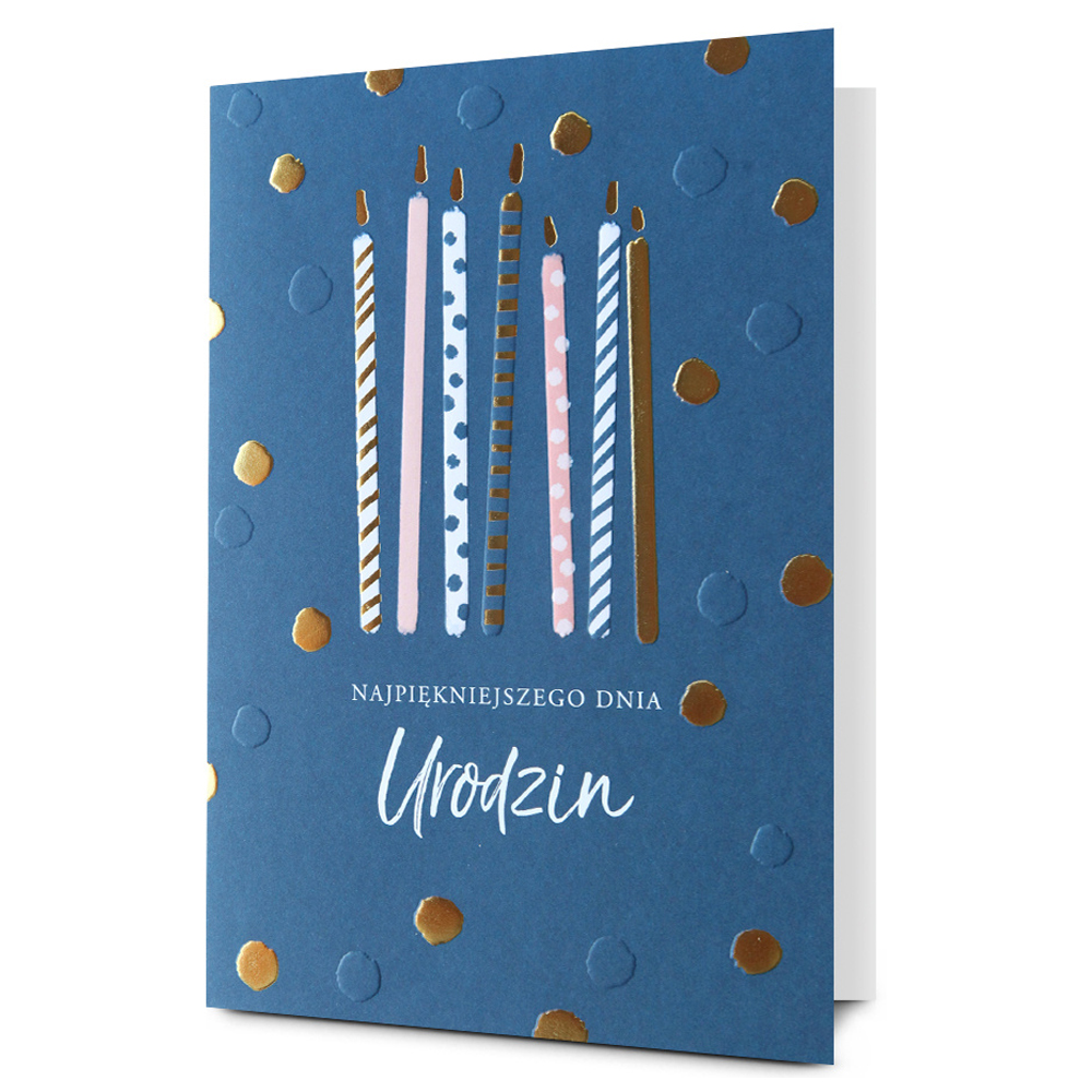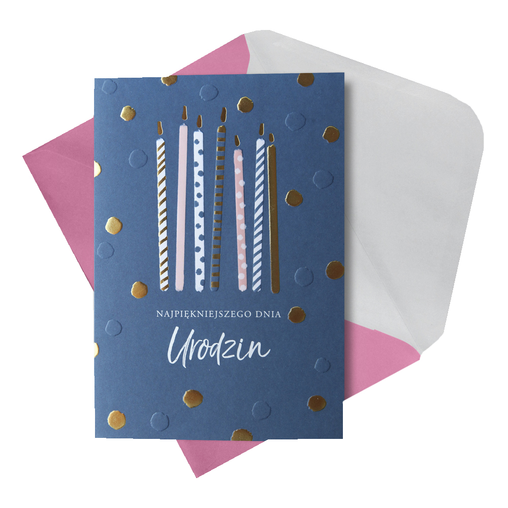 Kartka w kolorze granatowym ozdobiona świeczkami tortowymi, wypełniona kolorowymi groszkami oraz białym napisem "Najpiękniejszego Dnia Urodzin", wraz z życzeniami w środku oraz dopasowaną kolorystycznie kopertą doskonale się sprawdzi jako drobny upominek na urodziny!
