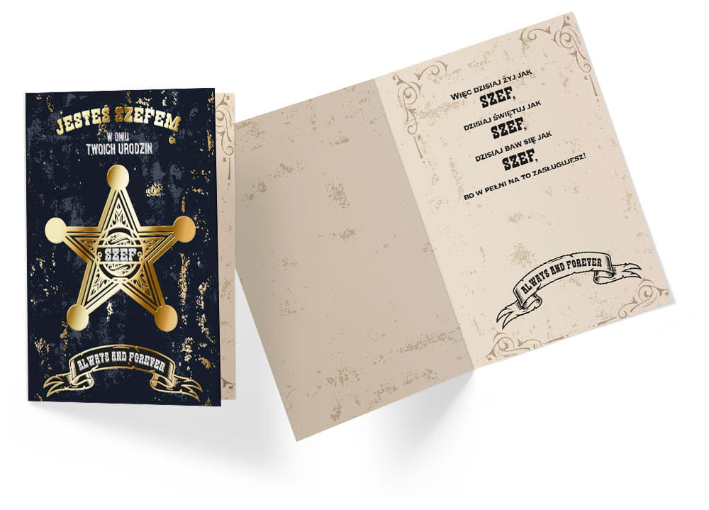 Kartka urodzinowa w kolorze granatowym, ozdobiona złotą odznaką szeryfa wraz z napisem "Jesteś szefem w dniu twoich urodzin Szef always and forever", wraz z życzeniami i kopertą w środku sprawdzi się idealnie z okazji urodzin!