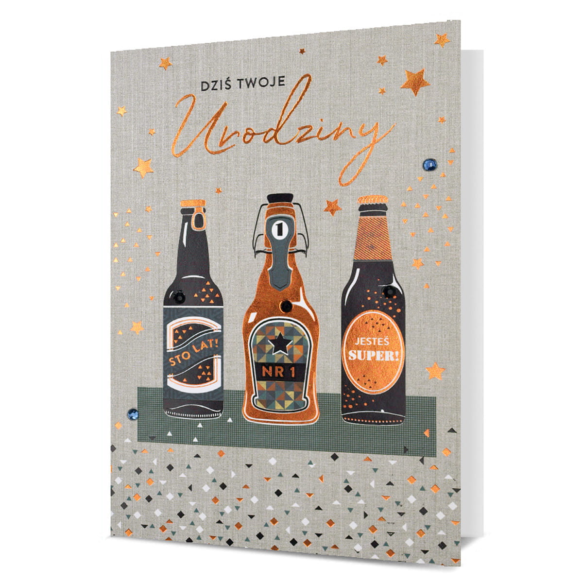 KARTKA URODZINOWA TRZY BUTELKI PIWA SZARA 19x13cm