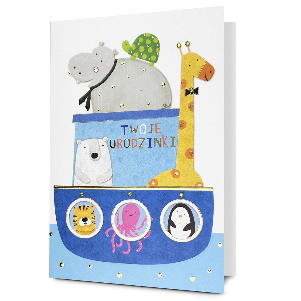 Kartka w kolorze białym ozdobiona uśmiechniętymi zwierzątkami z zoo w łódeczce, płynącej przez wodę oraz kolorowym napisem "Twoje urodzinki", wraz z życzeniami w środku oraz dopasowaną kolorystycznie kopertą doskonale się sprawdzi jako upominek na dziecięce urodziny!