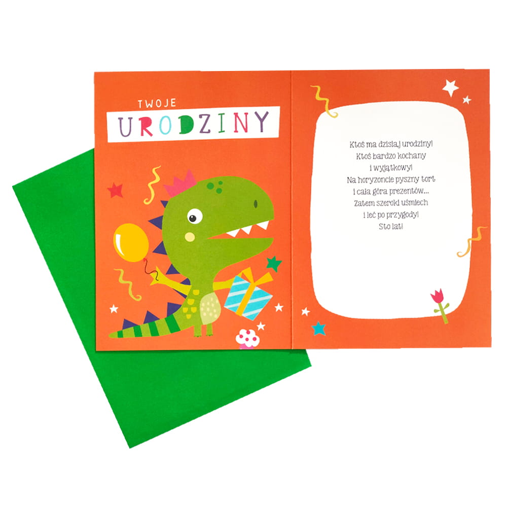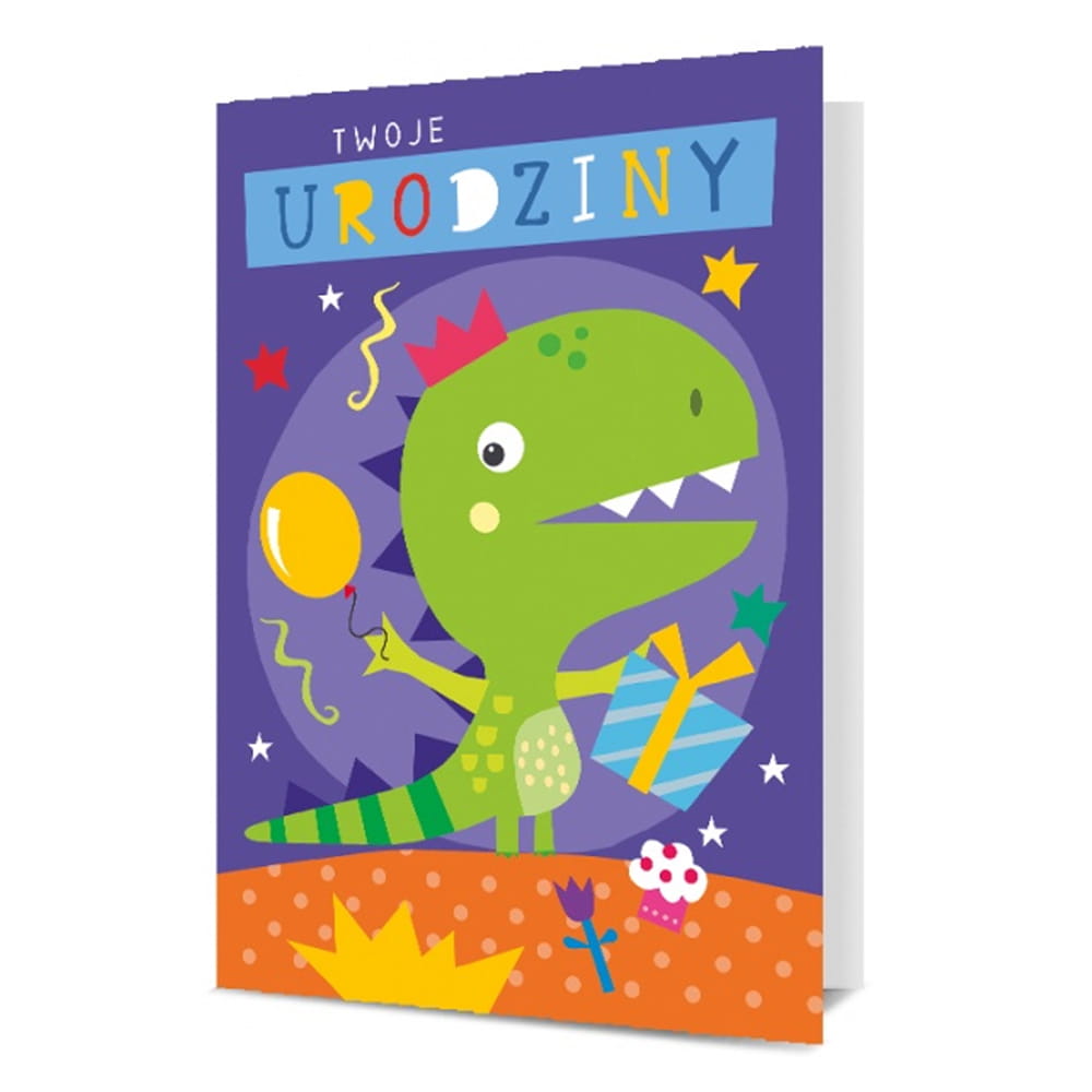KARTKA URODZINOWA TWOJE URODZINY DINOZAUR FIOLETOWA 17x12cm