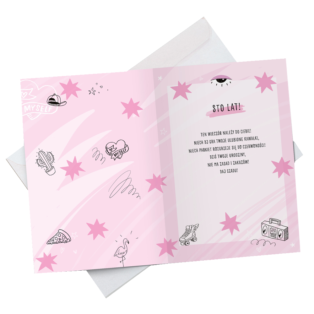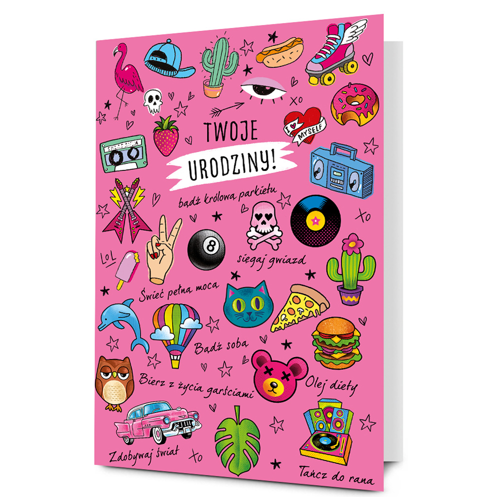 Kartka w kolorze różowym pełna zabawnych grafik w stylu "doodle" i motywacyjnymi hasłami oraz napisem "Twoje Urodziny!", wraz z życzeniami w środku oraz dopasowaną kolorystycznie kopertą doskonale się sprawdzi jak drobny upominek na urodziny!