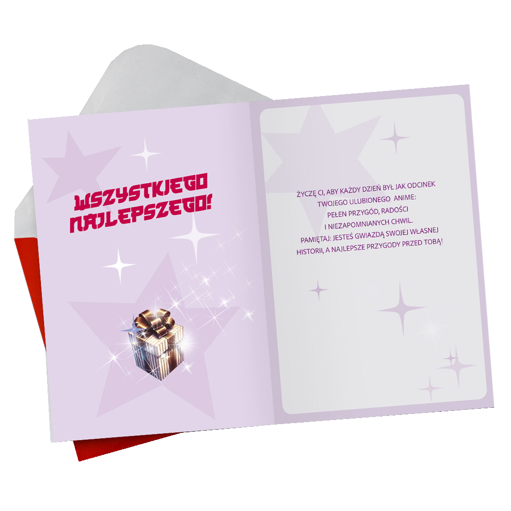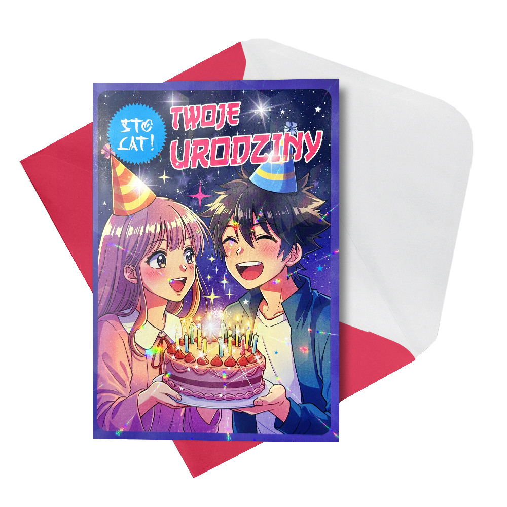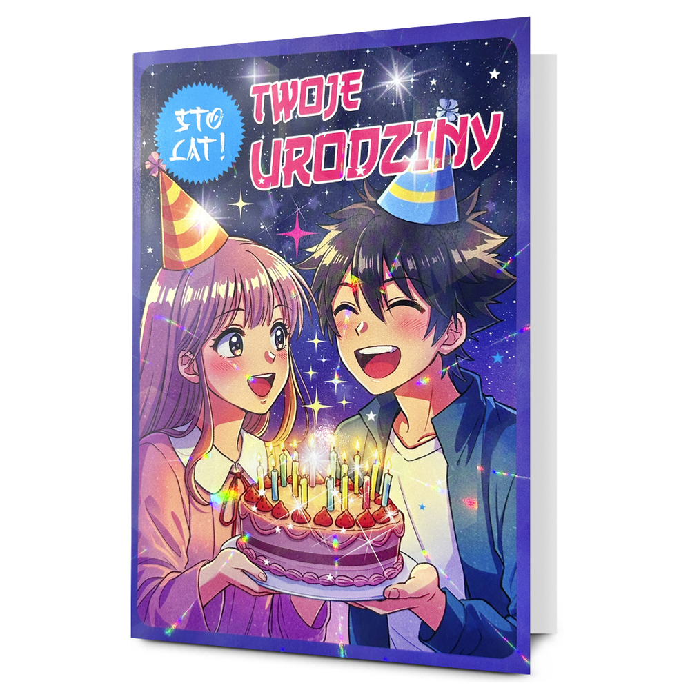 Granatowa kartka urodzinowa przedstawiająca postacie z mangi z tortem na imprezie urodzinowej oraz napisem "Twoje Urodziny", wraz z sentencją, życzeniami w środku oraz kolorystycznie dopasowaną kopertą sprawdzi się idealnie jako urodzinowy upominek!