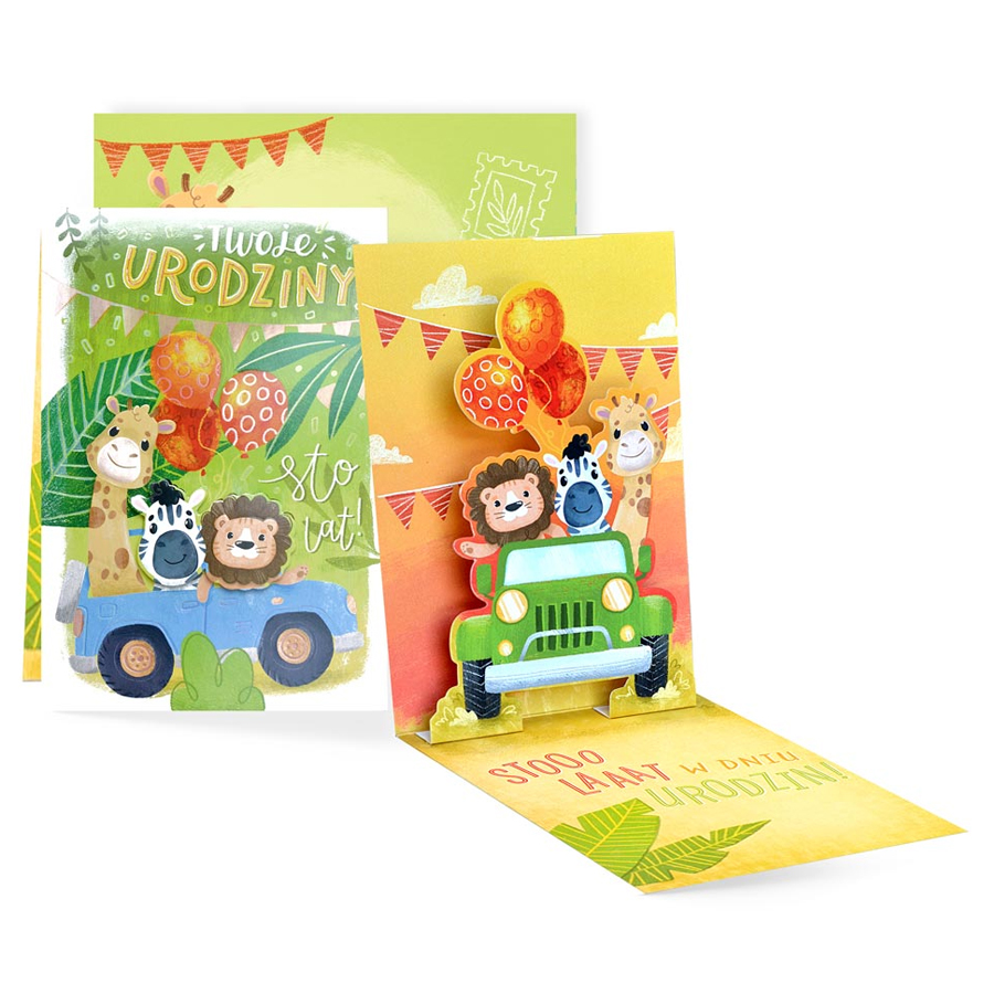 Dziecięca kartka urodzinowa udekorowana zwierzątkami safari w samochodzie terenowym, ozdobiona rozkładanym obrazkiem typu pin-up oraz z życzeniami w środku sprawdzi się doskonale jako urodzinowy upominek!