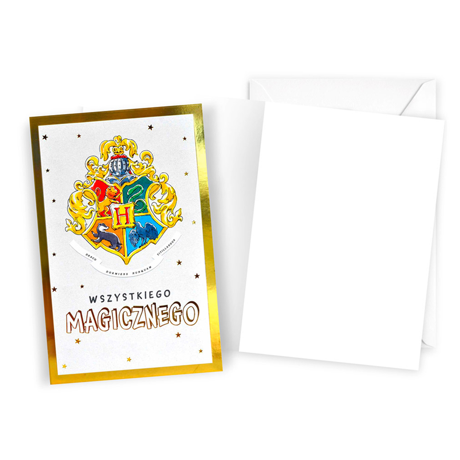 Kartka w kolorze białym ozdobiona złotą ramką, gwiazdkami, herbem Hogwartu oraz napisem "Wszystkiego magicznego" i bez życzeń w środku sprawdzi się idealnie na wiele okazji!