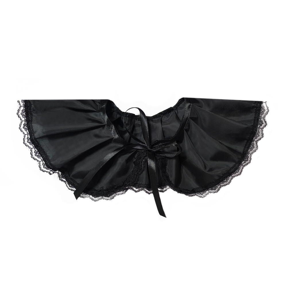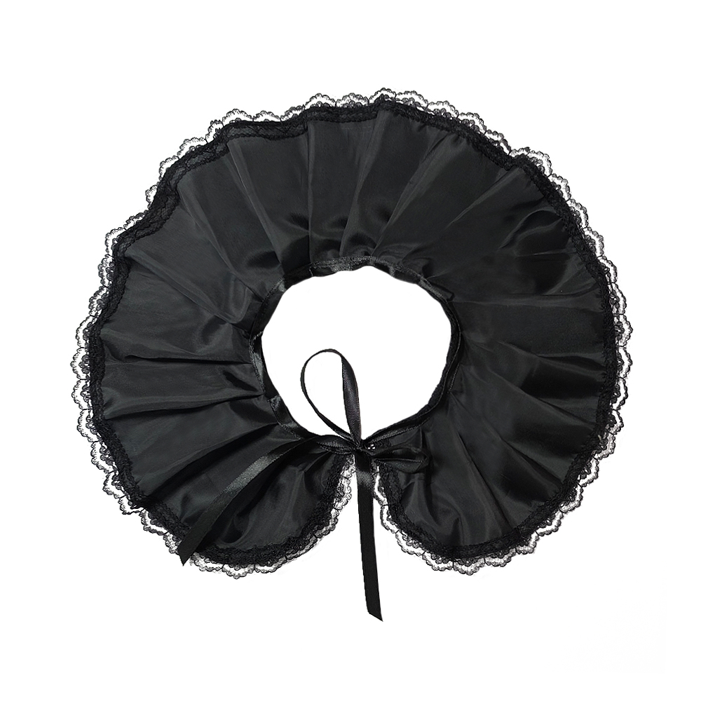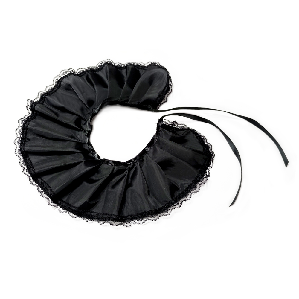 Czarny marszczony kołnierzyk wykonany z delikatnego materiału i obszyty na wewnętrznym brzegu zdobną koronką sprawdzi się idealnie jako dodatek do stroju halloweenowego, na przykład Wednesday! Dzięki tasiemce łatwo zawiążesz kołnierzyk pod szyją, aby się nie zsuwał!