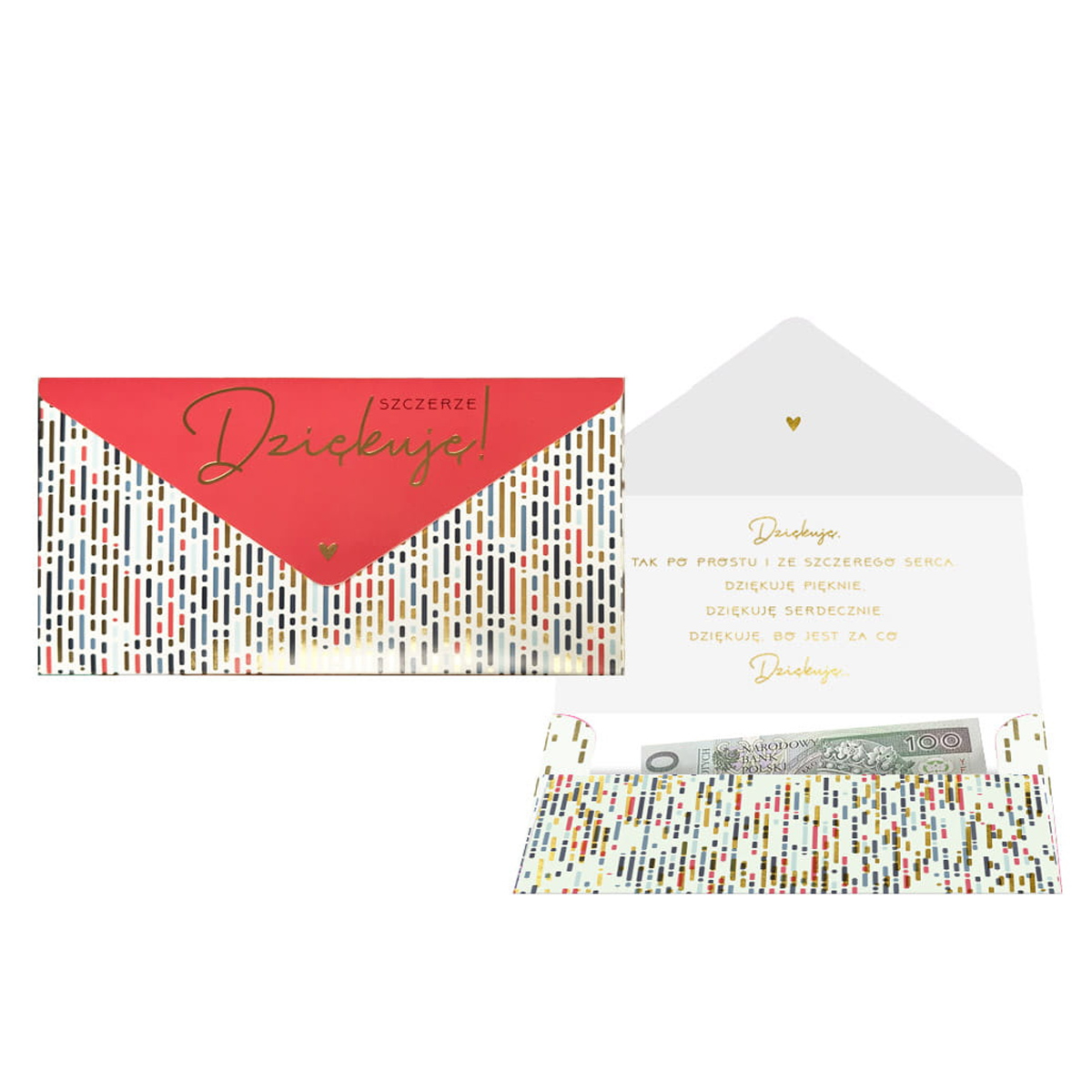 Zastanawiasz się, jak w elegancki sposób podarować bliskim kartkę lub banknoty? Oto specjalna koperta w kolorze biało-czerwonym, ozdobiona jest kolorowymi paseczkami oraz napisem "Szczerze dziękuję!". Wewnątrz koperty znajduje się miejsce na wpisanie imienia adresata wraz z krótkimi życzeniami.