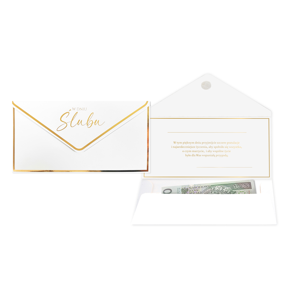 Zastanawiasz się, jak w elegancki sposób podarować bliskim kartkę lub banknoty? Oto specjalna koperta w kolorze białym, ozdobiona złotą obwódką oraz napisem "W dniu Ślubu". Wewnątrz koperty znajduje się miejsce na wpisanie imienia adresata wraz z krótkimi życzeniami.