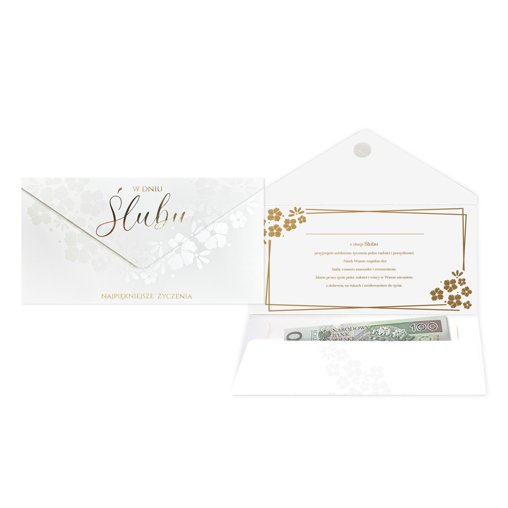 Zastanawiasz się, jak w elegancki sposób podarować bliskim kartkę lub banknoty? Oto specjalna koperta w kolorze białym, ozdobiona delikatnymi kwiatkami oraz napisem "W dniu Ślubu". Wewnątrz koperty znajduje się miejsce na wpisanie imienia adresata wraz z krótkimi życzeniami.