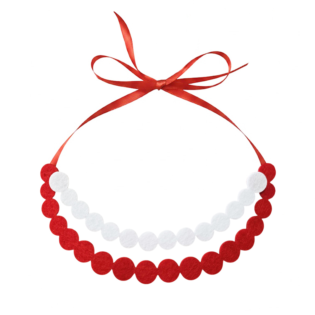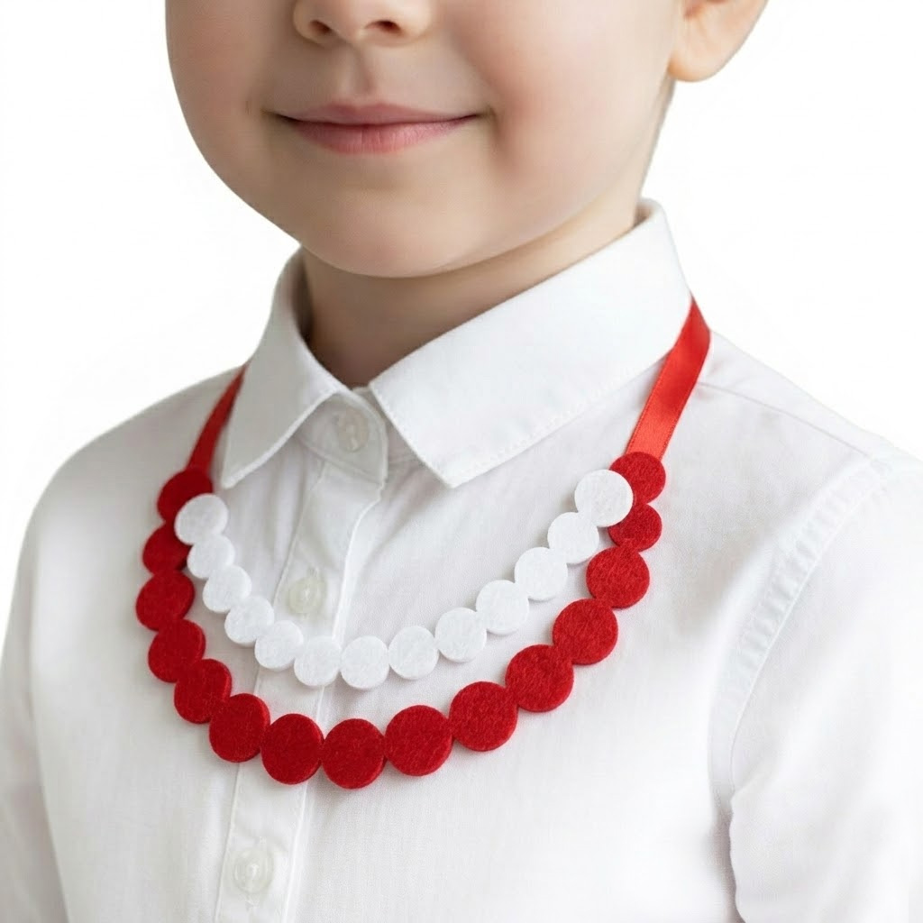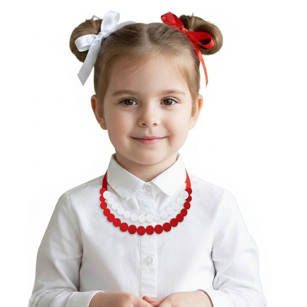 Ten wariant składa się z dwóch warstw starannie wyciętych, filcowych elementów w kolorach białym i czerwonym, które pięknie układają się na dekolcie, tworząc wyrazistą i kaskadową ozdobę. Całość jest zamocowana na dwóch wytrzymałych, czerwonych tasiemkach satynowych, co gwarantuje łatwe dopasowanie obwodu do szyi dziecka lub osoby dorosłej. Mimo swojej okazałości, korale pozostają piórkowo lekkie i bezpieczne dla skóry.