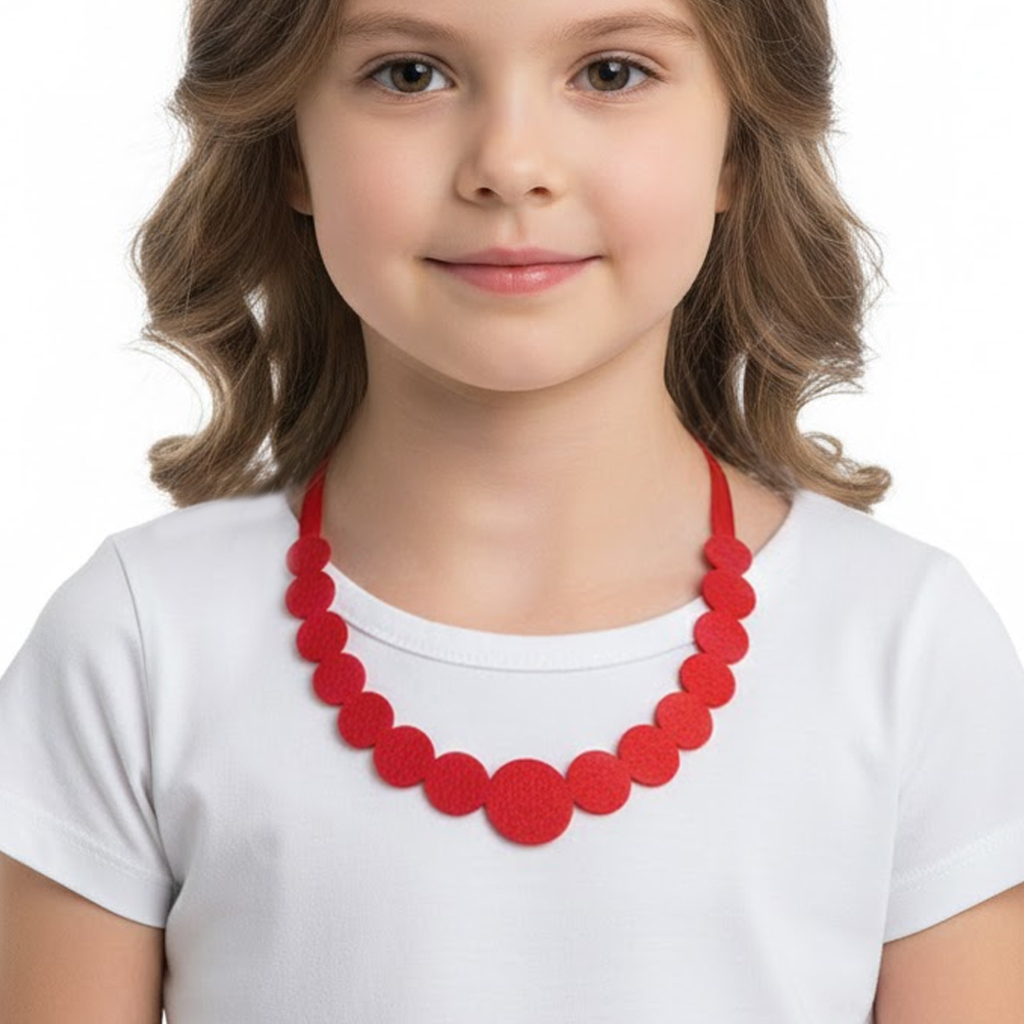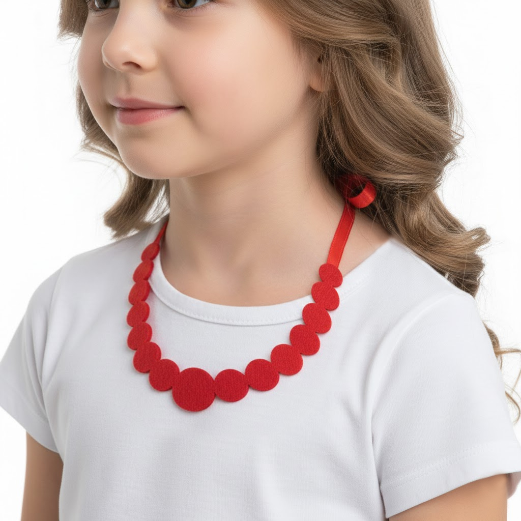 Wykonane z jednej warstwy wysokiej jakości czerwonego filcu, są niezwykle lekkie i komfortowe w noszeniu, nawet przez cały dzień. Elementy zostały precyzyjnie wycięte i nawleczone na dwie eleganckie, satynowe tasiemki, które pozwalają na swobodną regulację długości i wiązanie na uroczą kokardę.