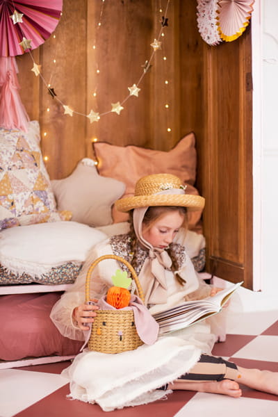 Koszyk Króliczek wykonany z papieru z materiałowymi uszami w kolorze różowym, wysokość ok. 28 cm, średnica ok. 17 cm.