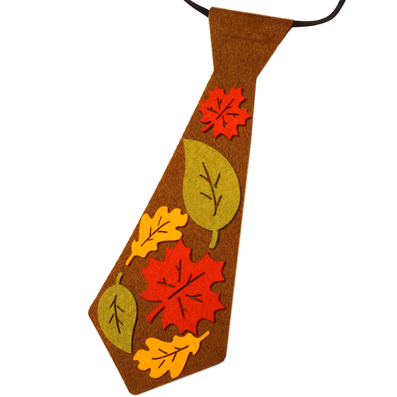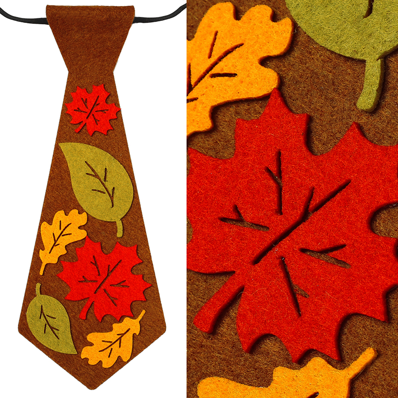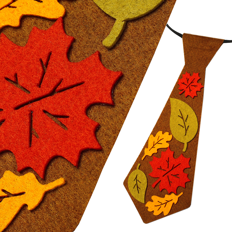 Krawat, wykonany z miękkiego, brązowego filcu, jest ozdobiony kolorowymi filcowymi listkami w ciepłych, jesiennych odcieniach czerwieni, pomarańczu i żółci. Mocowany jest na elastycznej gumce, gwarantując komfort noszenia przez cały dzień zabawy!