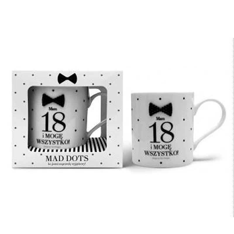 Ceramiczny kubek w kolorze białym ozdobiony czarnymi groszkami, czarną muszką oraz napisem "Mam 18 i mogę wszystko!" i zapakowany w estetyczny kartonik to doskonały pomysł na prezent z okazji osiemnastych urodzin!