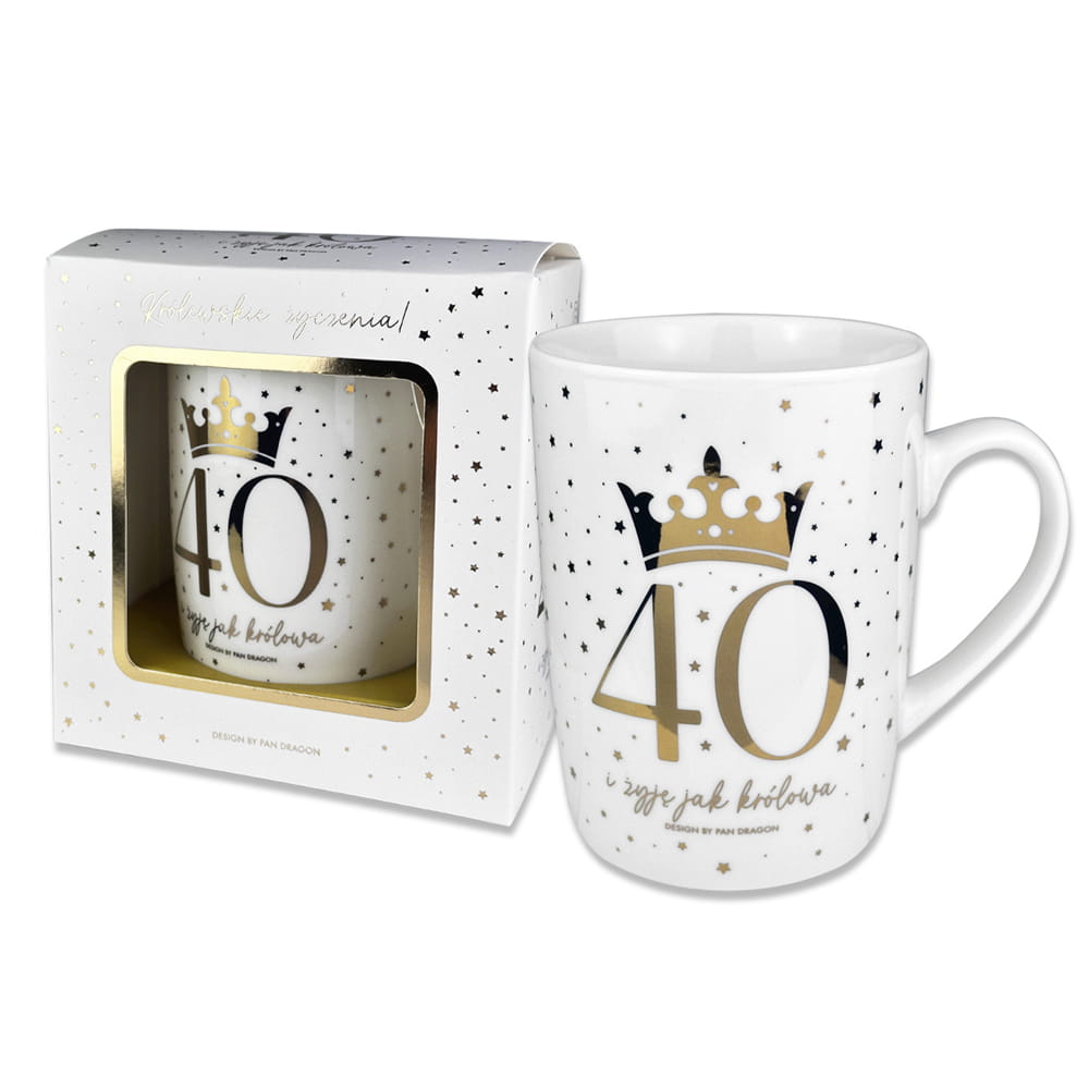 Ceramiczny kubek w kolorze białym ozdobiony złotymi groszkami, liczbą "40" oraz napisem "i żyję jak królowa" i zapakowany w estetyczny kartonik to doskonały pomysł na prezent z okazji urodzin!