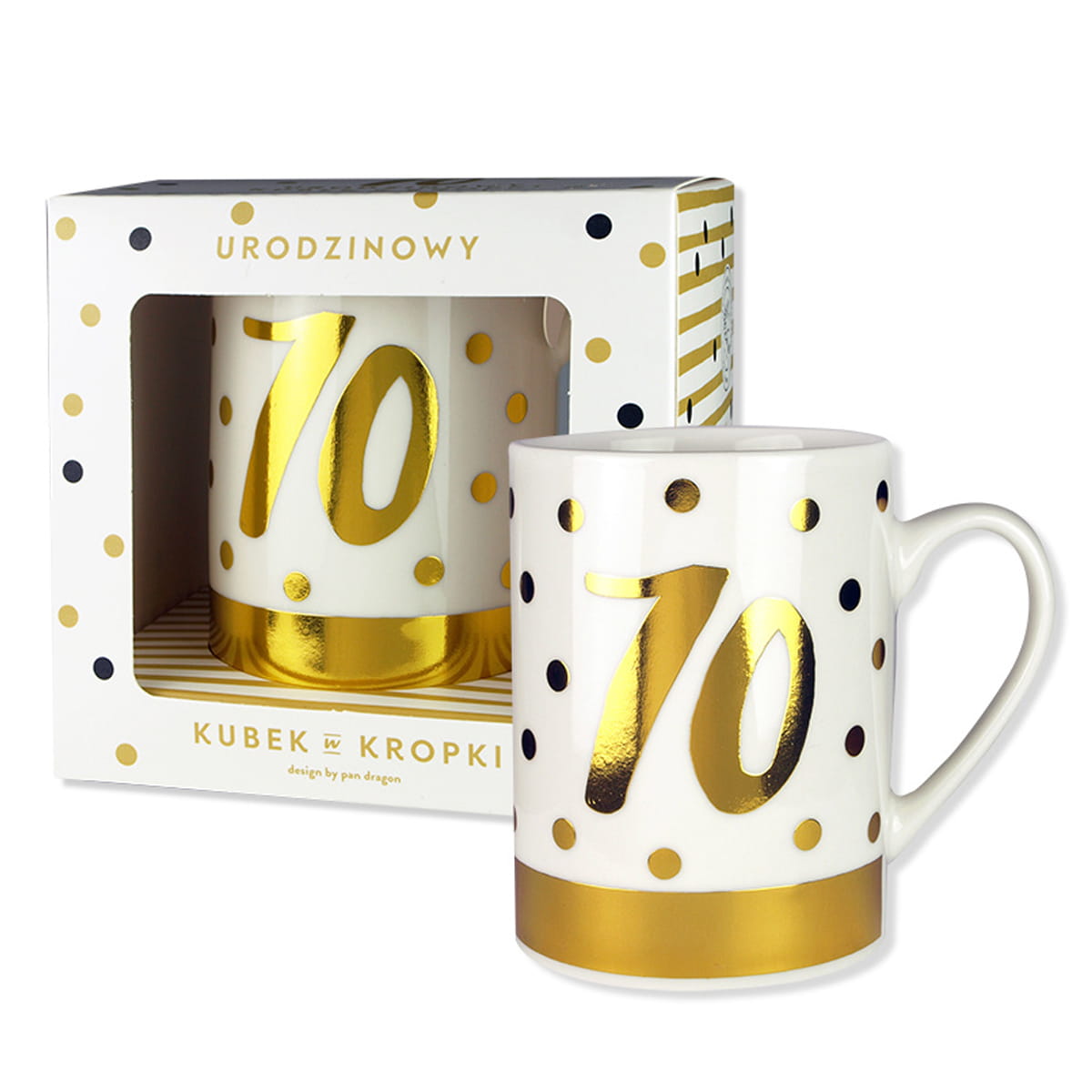 Ceramiczny kubek w kolorze białym ozdobiony złotymi groszkami oraz liczbą "70" i zapakowany w estetyczny kartonik to doskonały pomysł na prezent z okazji siedemdziesiątych urodzin!