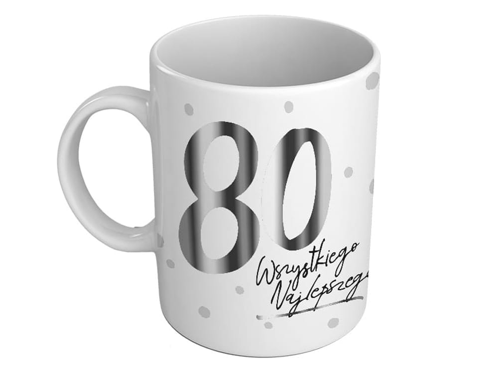 Kubek w kolorze białym wykonany z porcelany ozdobiony szarymi groszkami i napisem "80 Wszystkiego Najlepszego!" idealnie się sprawdzi jako prezent z okazji 80. urodzin!