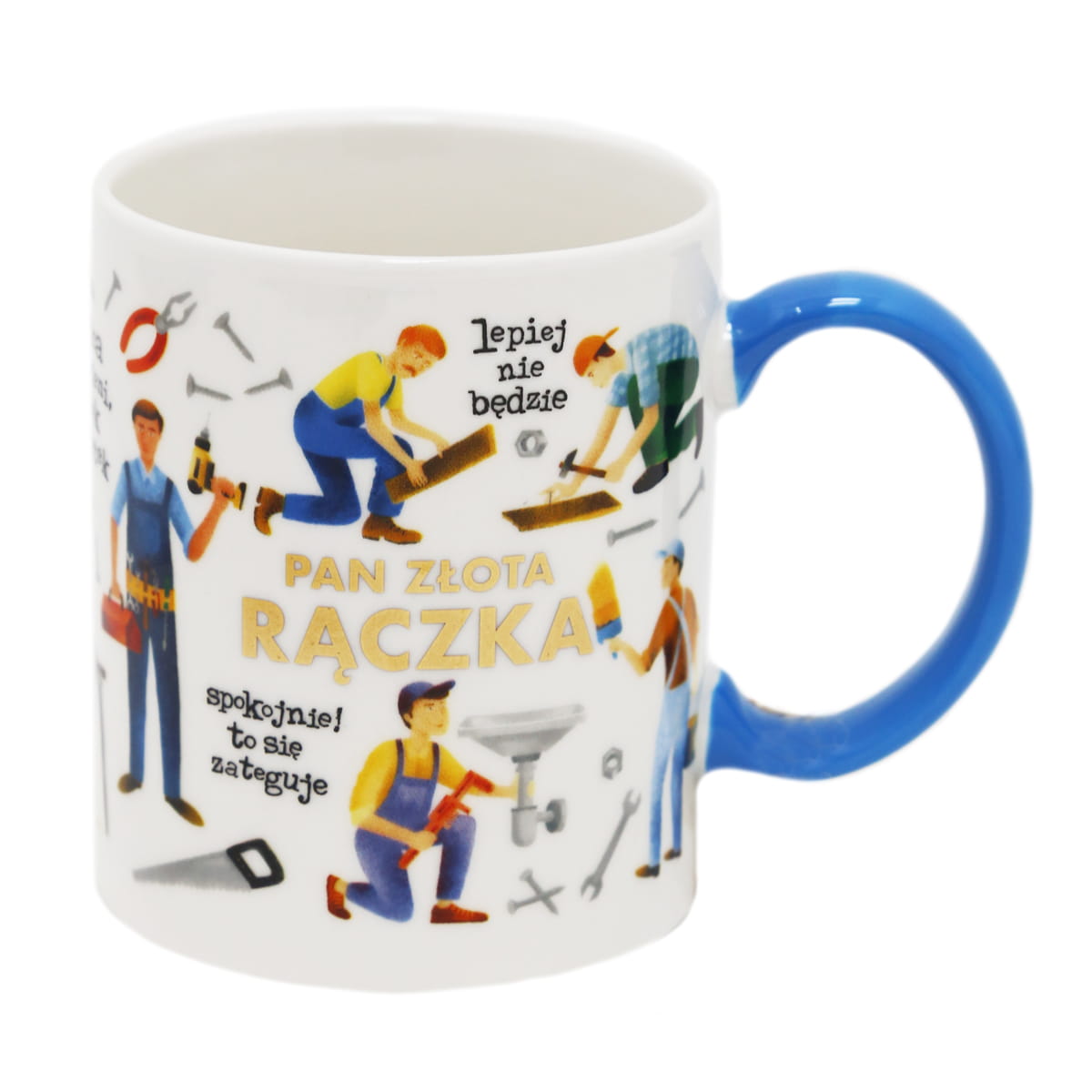 Ceramiczny kubek w kolorze białym ozdobiony obrazkami panów mechaników, hasłami związanymi z naprawami oraz napisem "Pan Złota Rączka" to idealny pomysł na prezent dla każdego pasjonata majsterkowania!