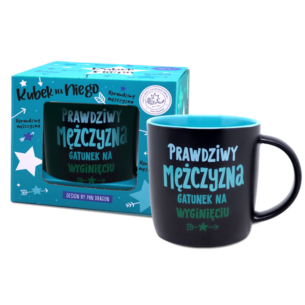 Kubek w kolorze czarnym wykonany z porcelany z napisem "Prawdziwy mężczyzna - gatunek na wyginięciu" idealnie się sprawdzi jako prezent na wiele okazji!