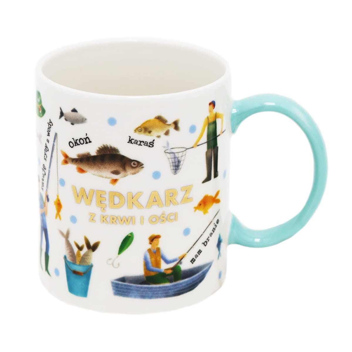 Ceramiczny kubek w kolorze białym ozdobiony rybami i łowiącymi je wędkarzami, hasłami związanymi z łowieniem ryb oraz napisem "Wędkarz z krwi i ości" to idealny pomysł na prezent dla każdego wędkarza!