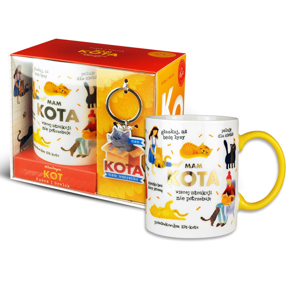 Ceramiczny kubek w kolorze białym ozdobiony wieloma kotkami hasłami związanymi z kotami oraz napisem "Mam kota, więc atrakcji nie potrzebuję" W zestawie z brelokiem w kształcie napisu "Mam kota mam wszystko" to idealny pomysł na prezent dla każdego wielbiciela kotów!