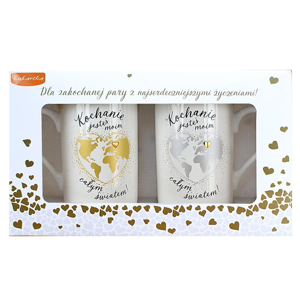 Zestaw dwóch ceramicznych kubków w kolorze białym, ozdobionych srebrnym i złoty globusem w kształcie serca oraz napisem "Kochanie, jesteś moim całym światem" idealnie się sprawdzi jako ślubny prezent!