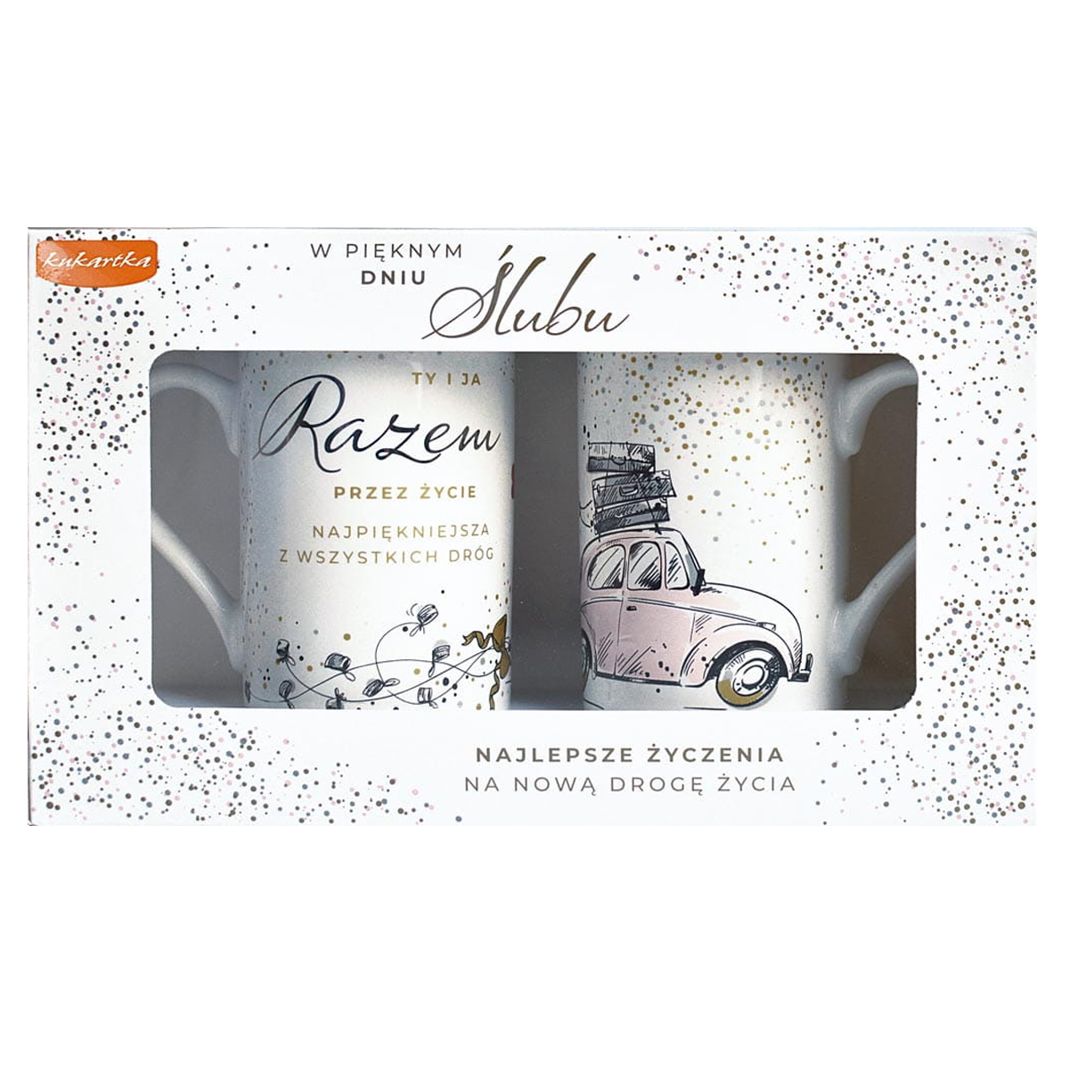 Zestaw dwóch ceramicznych kubków w kolorze białym, ozdobionych złotymi groszkami, ślubnym autem oraz napisem "Ty i Ja razem przez życie najpiękniejsza z wszystkich dróg" idealnie się sprawdzi jako ślubny prezent!