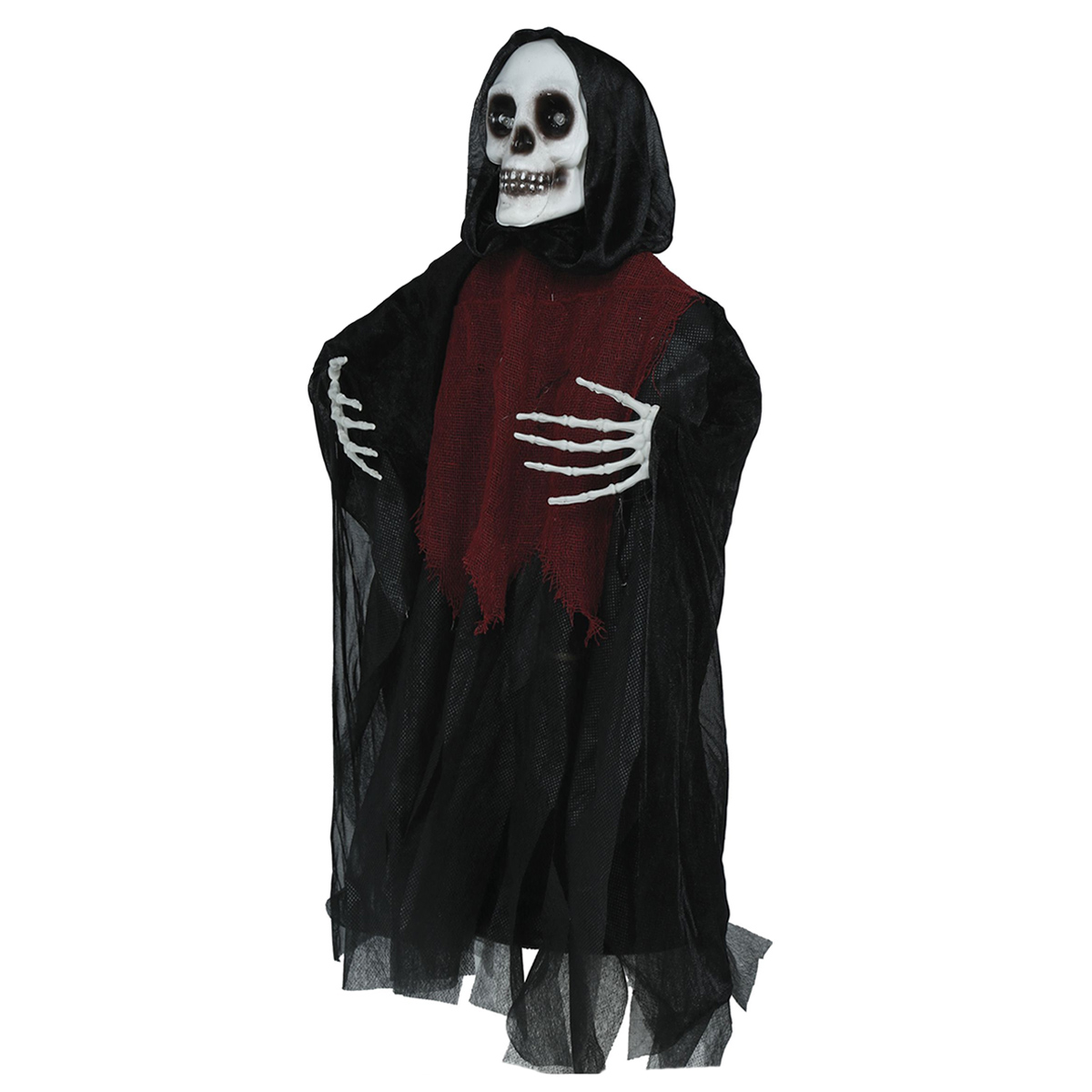 Szukasz elektryzującej dekoracji na halloweenowe przyjęcie? Ta wyjątkowa kukła jednocześnie zachwyci i przerazi Twoich gości! Kukła w kształcie szkieletu z czerwonymi oczami świetnie wpisuje się w upiorny, halloweenowy klimat, a dodatkowe udogodnienia takie jak światło, ruch i dźwięk jeszcze bardziej urealniają ozdobę i podsycają doznane przeżycia! Kukiełka ma aż 60 cm wysokości, dzięki czemu nie da się jej przegapić!
