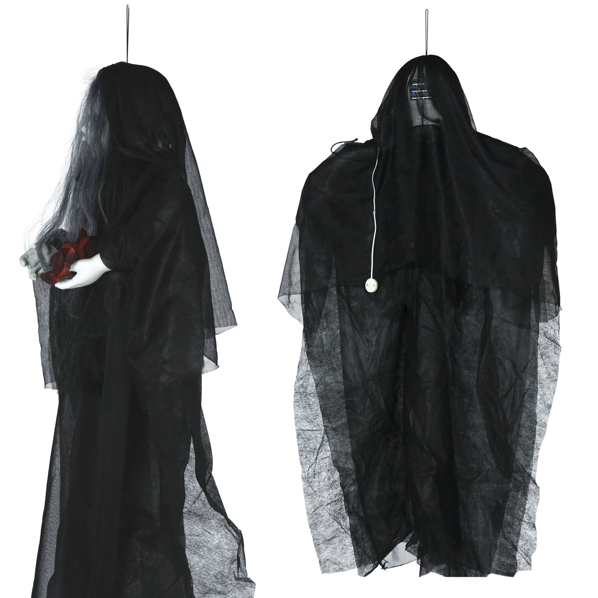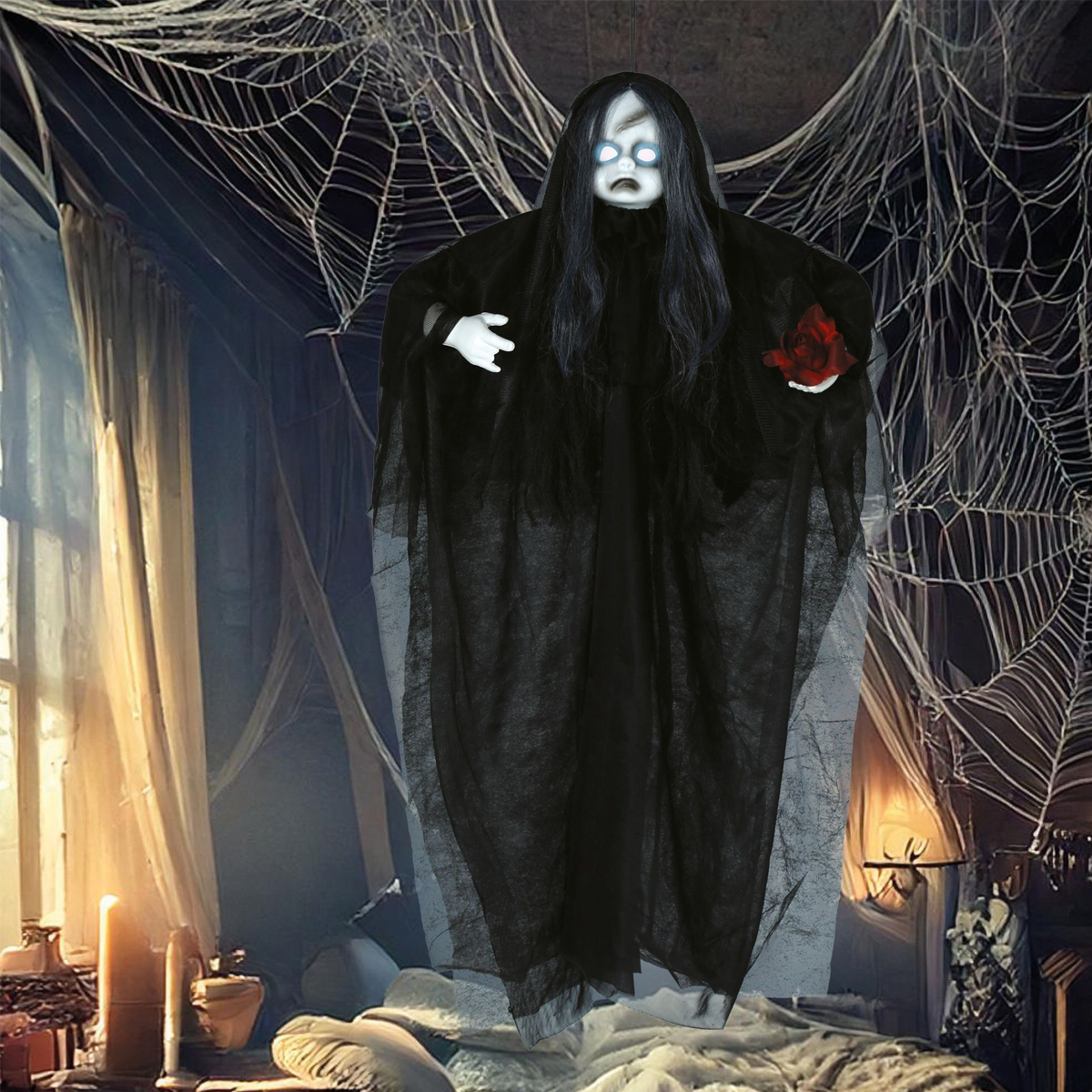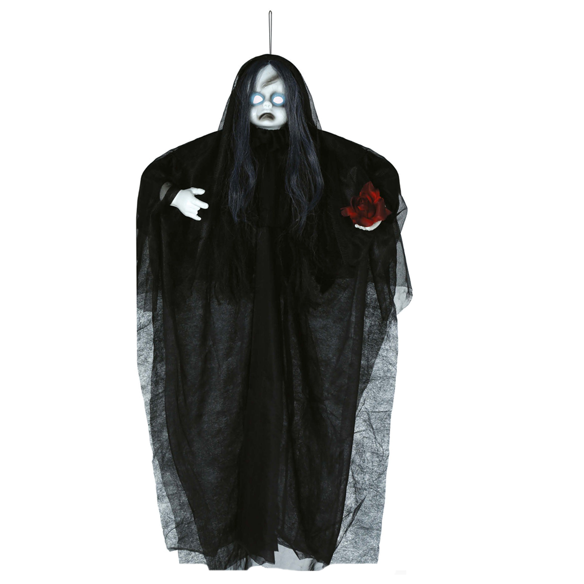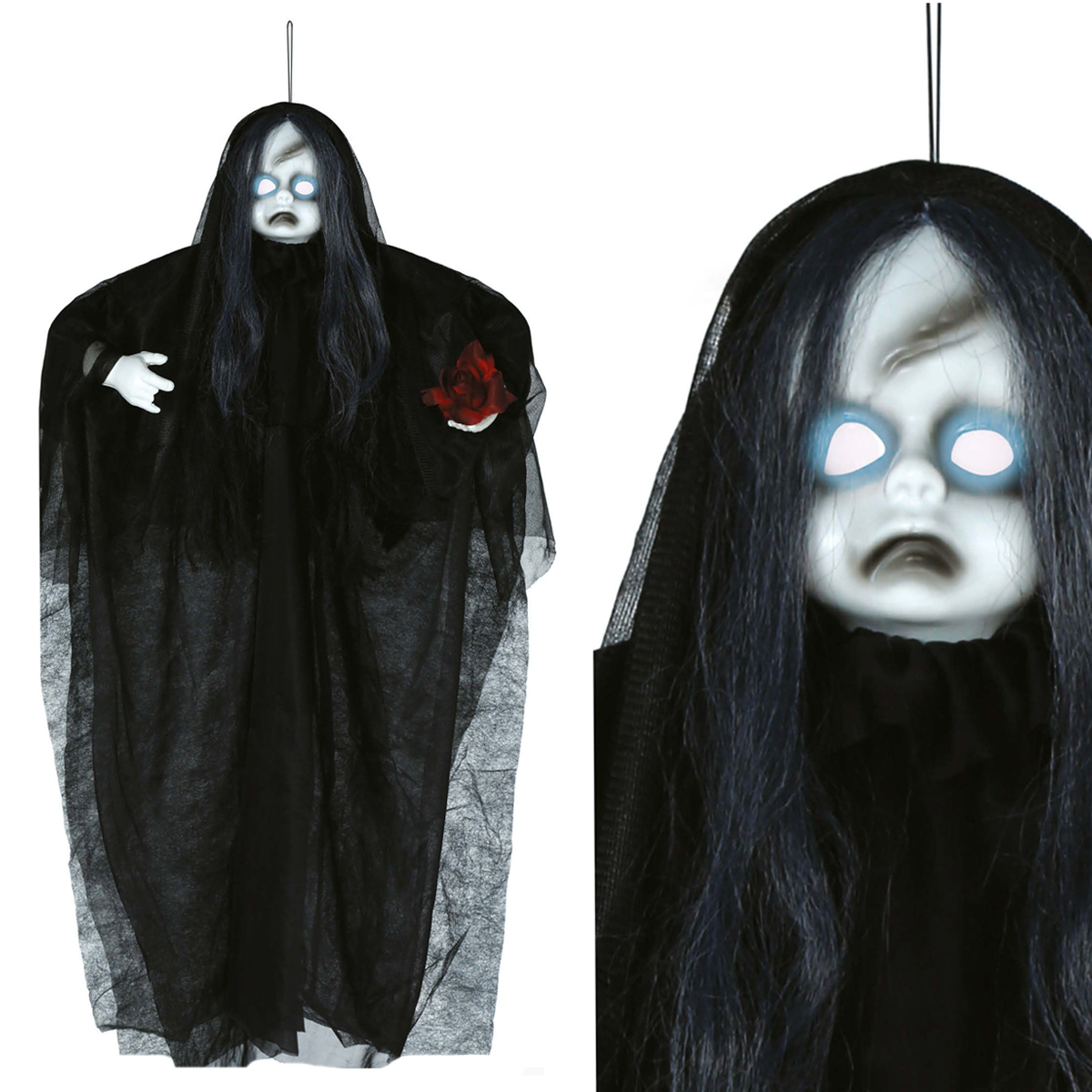 KUKŁA WISZĄCA UPIORNA LALKA ŚWIATŁO DŹWIĘK CZARNA 90cm
