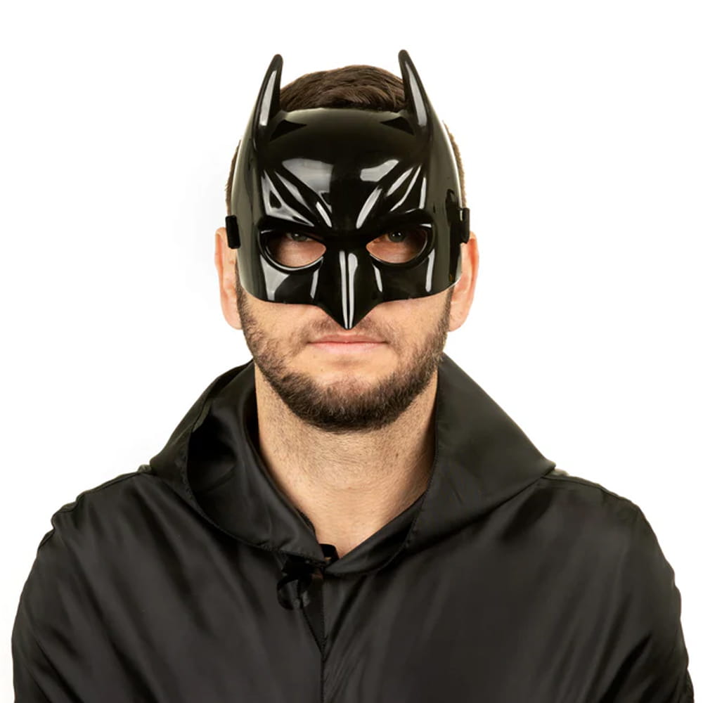 Czarna, plastikowa maska mocowana z tyłu na gumce to doskonały rekwizyt do stroju superbohatera Batmana! Załóż maskę, zarzuć pelerynę i wciel się w bohatera pilnującego porządku w mieście!
