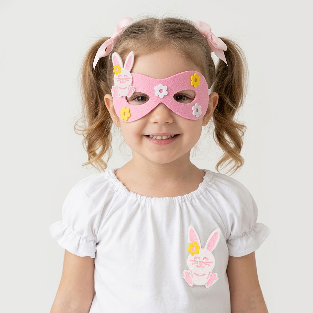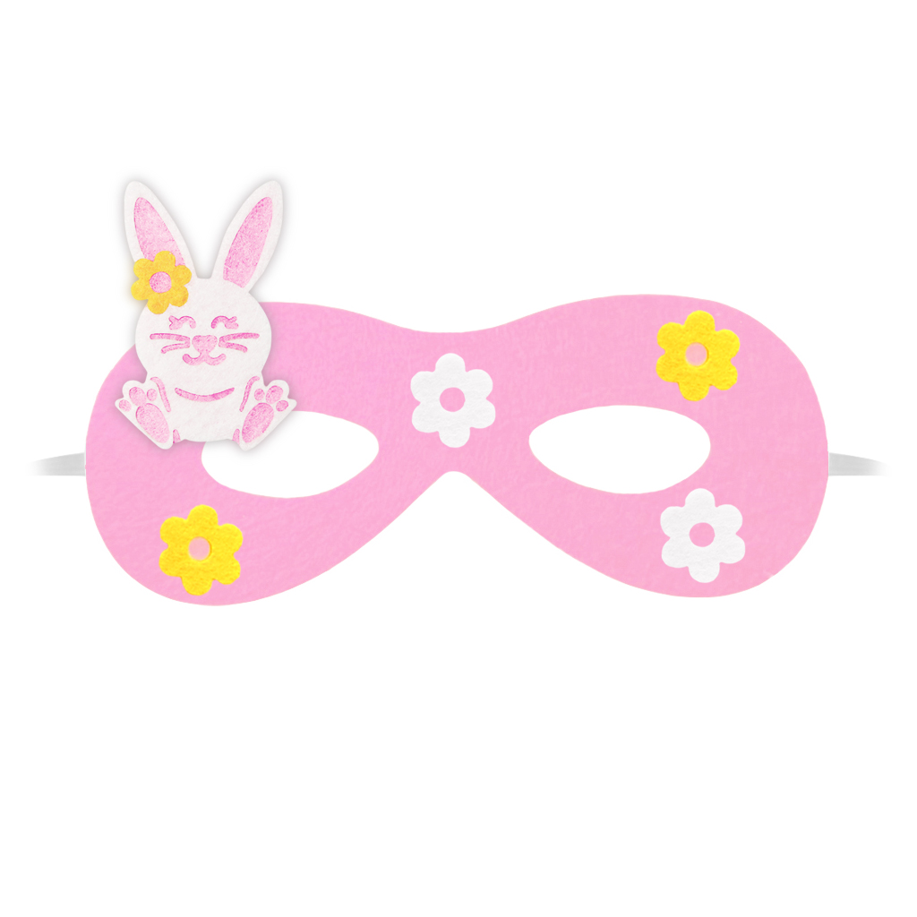Przedstawiamy filcową maskę króliczka w kolorze różowym, która z pewnością pobudzi wyobraźnię do działania! Maska została udekorowana biało-różowym emblematem uśmiechniętego króliczka oraz kilkoma białymi i żółtymi kwiatkami, nadając jej wesoły i zabawny charakter! Z tyłu przymocowana jest elastyczna gumka, dzięki czemu maska stabilnie układa się na głowie, zapewniając komfort podczas każdej zabawy.