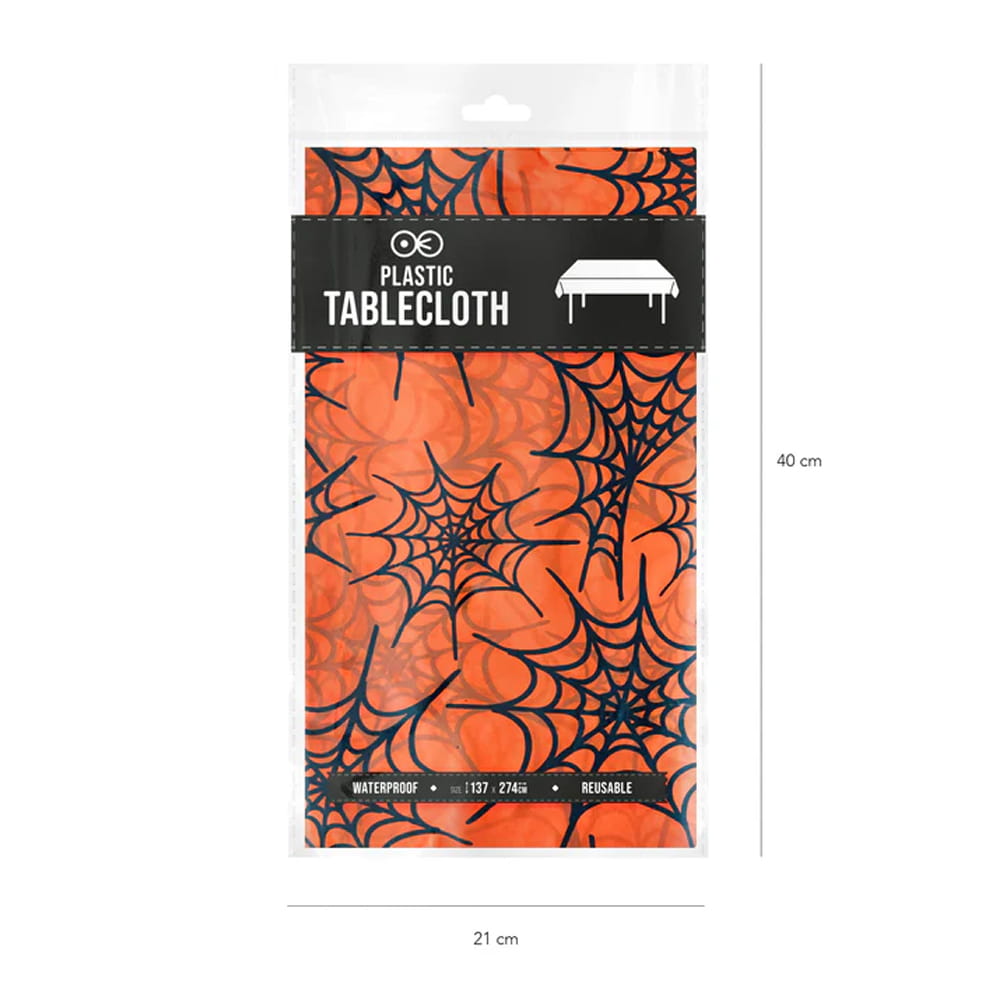 Udekoruj swój halloweenowy stół w taki sposób, by oddać klimat tego wyjątkowego święta! Pomarańczowy obrus foliowy ozdobiony czarnymi pajęczynami i pająkami świetnie sprawdzi się w tej roli!