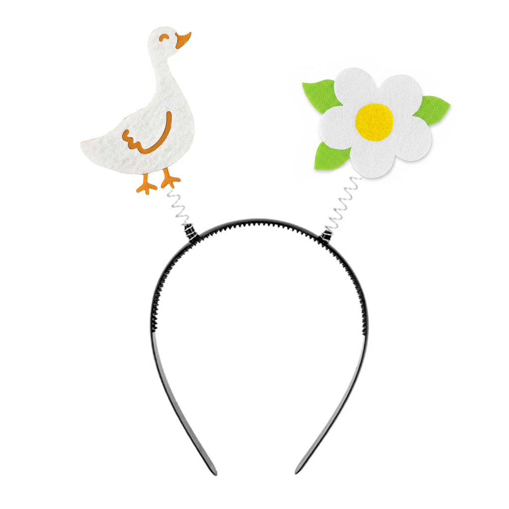 Plastikowa opaska wyposażona jest w dwie elastyczne sprężynki, na których końcach przymocowano radosną gąskę oraz biały kwiatek, wykonane z dwóch warstw miękkiego filcu. Opaska ma rozmiar uniwersalny, dzięki czemu będzie pasować zarówno dzieciom, jak i dorosłym!