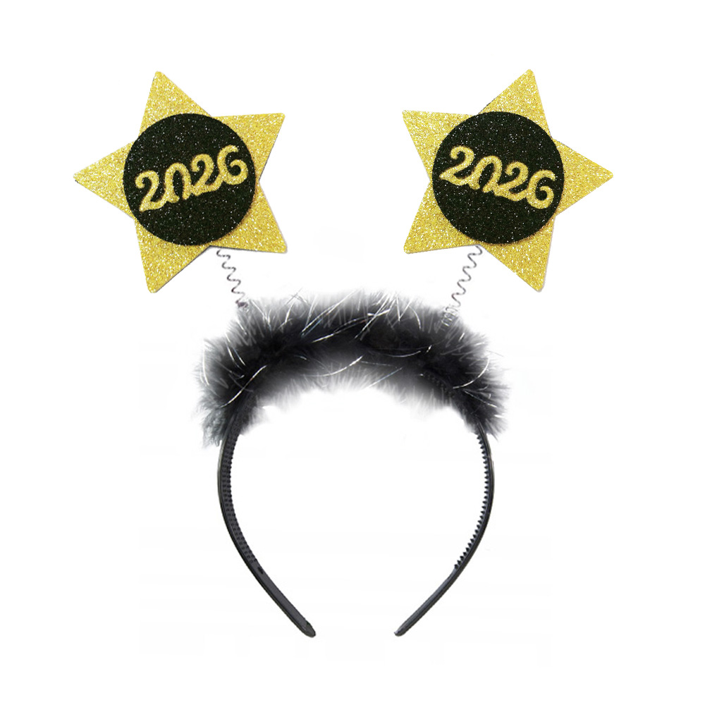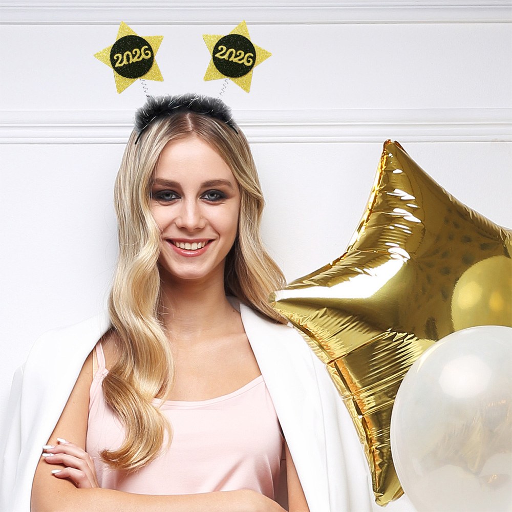 Opaska z dwiema złotymi, brokatowymi gwiazdkami wykonanymi z pianki, wraz z czarnym kółkiem i wpisanym w niego napisem "2026" to doskonały dodatek do sylwestrowego przebrania! Dodaj odrobinę błysku całej swojej kreacji, wchodząc z radością w nowy, kolejny rok!