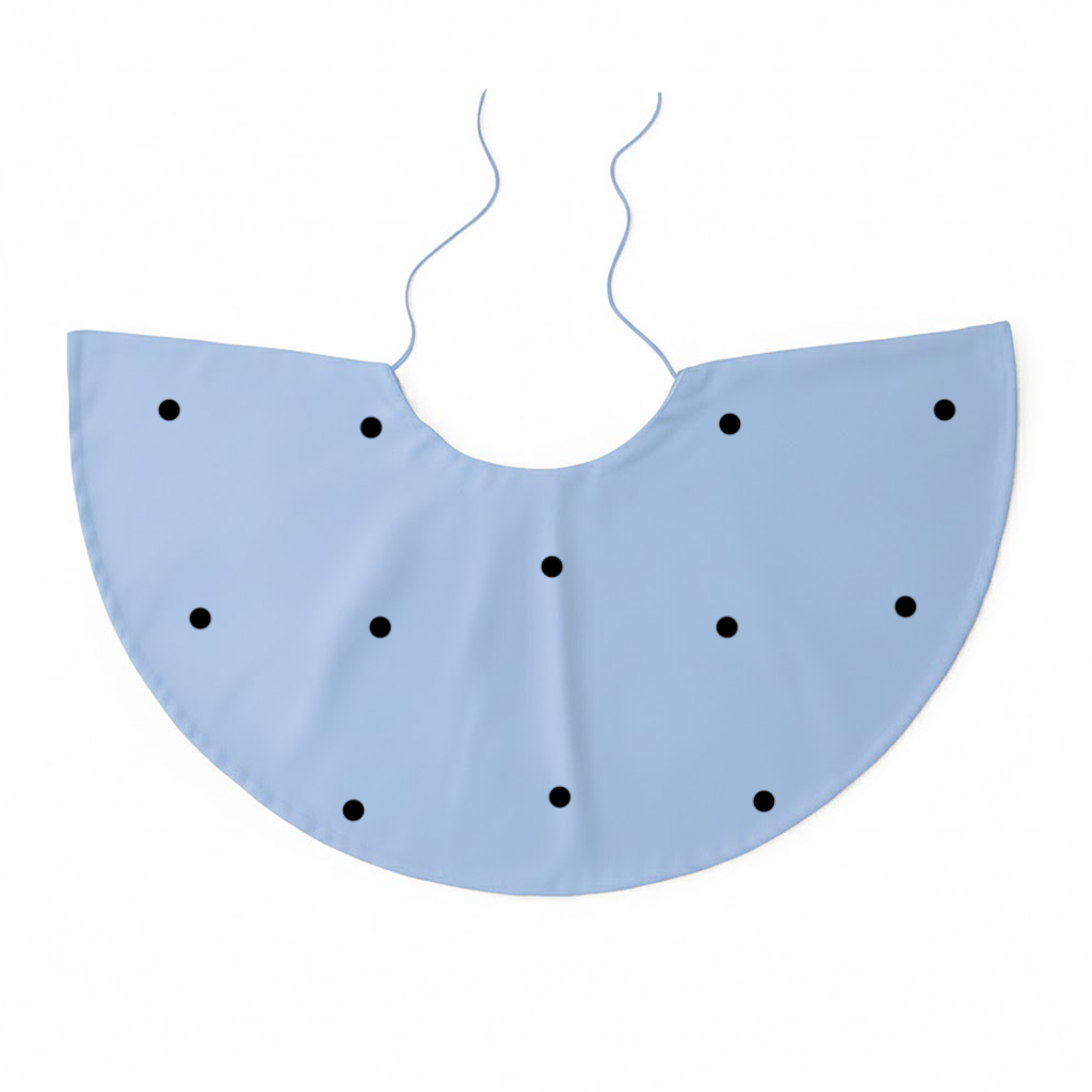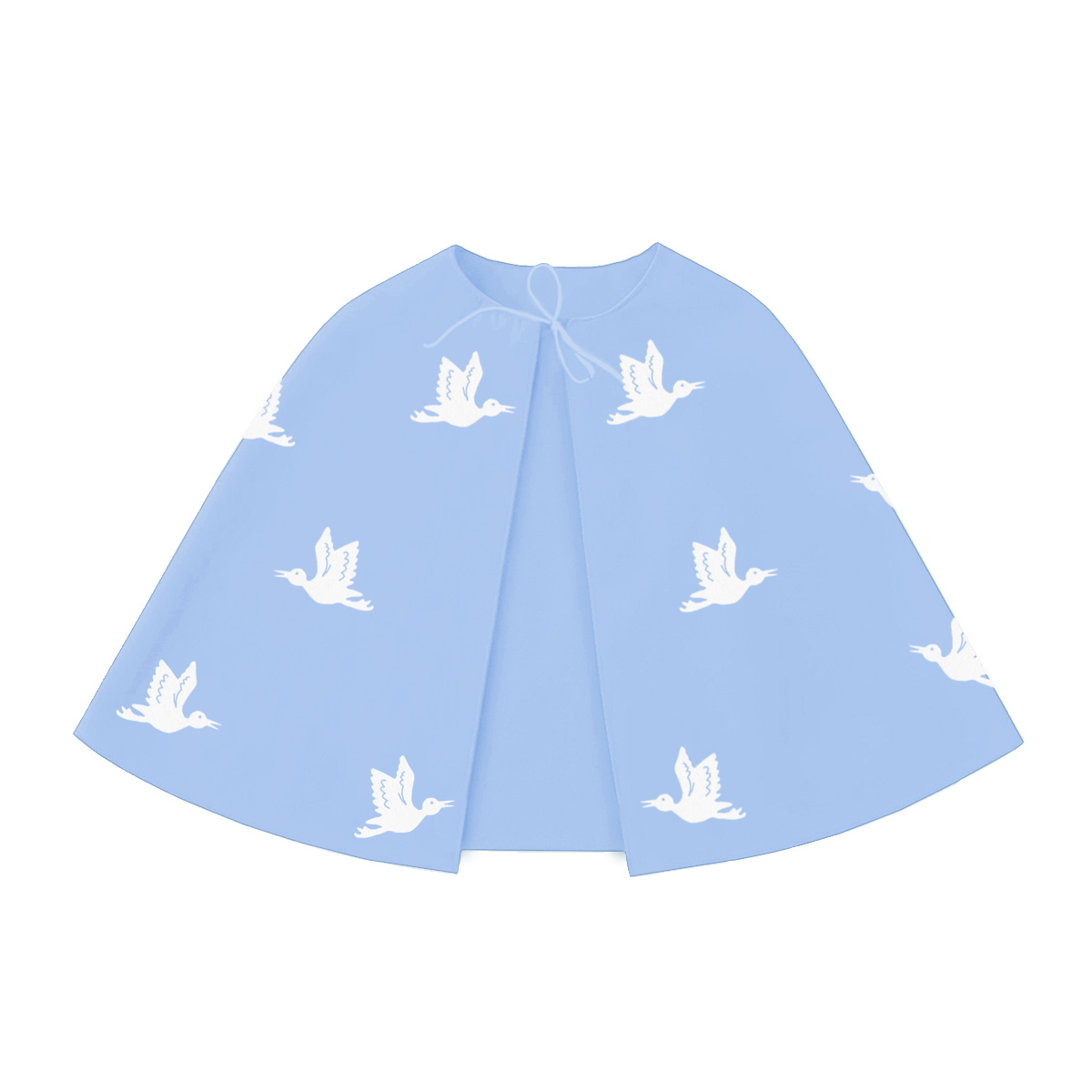 Błękitna pelerynka wykonana jest z lekkiego materiału pongee, który pięknie układa się podczas ruchu, tworząc eteryczny efekt. Do pelerynki przyczepione są małe, okrągłe rzepy, które służą do przypięcia białych filcowych bocianów dołączonych do zestawu. Ten kreatywny sposób sprawia, że Twoje Dziecko może wziąć udział w tworzeniu własnego stroju, dając mu satysfakcję z wykonanego zadania!