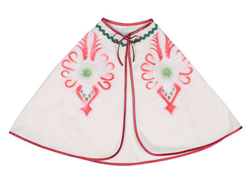 Polarowa pelerynka w kolorze écru, obszyta na brzegach czerwoną tasiemką oraz ozdobiona czarnymi parzenicami sprawdzi się doskonale do stroju górala! Pelerynka zakrywa plecy i ramiona, a wiązana jest pod szyją, dzięki czemu jest bardzo wygodna w użyciu.