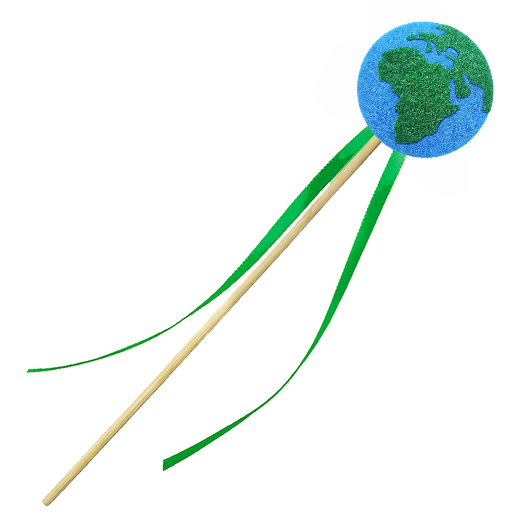Różdżka składa się z trzech elementów: drewnianego patyczka, solidnie przymocowanego emblematu Ziemi oraz dwóch zielonych tasiemek. Glob został wykonany z dwóch warstw miękkiego filcu: niebieskiej bazy oceanu i zielonej nakładki lądów. Dwie zielone tasiemki subtelnie powiewają przy każdym ruchu, dodając magii i elegancji!