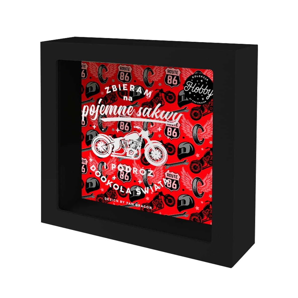 Kwadratowa skarbonka w czarnej ramce z czerwonym tłem i szklaną szybką ozdobioną białym motorem i napisem "Zbieram na pojemne sakwy i podróż dookoła świata" sprawdzi się idealnie jako prezent na wiele okazji!