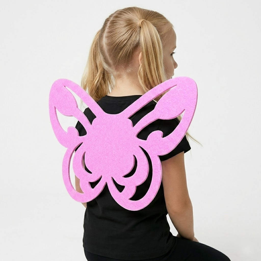 Ażurowe skrzydła z filcu o charakterystycznym, motylim profilu to propozycja dla osób szukających czegoś wyjątkowego. Wewnętrzne, precyzyjne wycięcia nadają im lekkości i sprawiają, że pięknie prezentują się na tle kontrastowego ubranka. Mimo ażurowej formy, zastosowanie wysokiej jakości filcu gwarantuje, że skrzydła nie opadają i zachowują swój pierwotny kształt. Elastyczne gumki mocowane z tyłu pozwalają na wygodne nałożenie skrzydeł jak plecaka, co sprawia, że są praktycznie niewyczuwalne podczas noszenia.