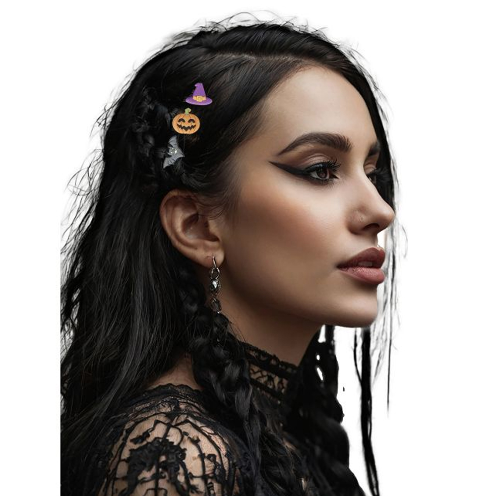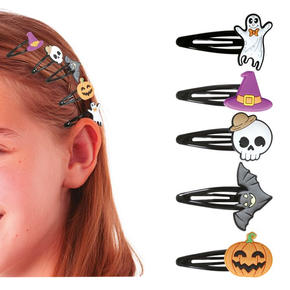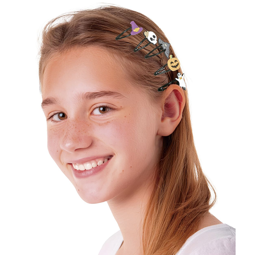 Zestaw czarnych spinek do włosów ozdobionych halloweenowymi emblematami takimi jak duszek, dynia, nietoperz, wiedźmi kapelusz czy czaszka to doskonała halloweenowa ozdoba do włosów!