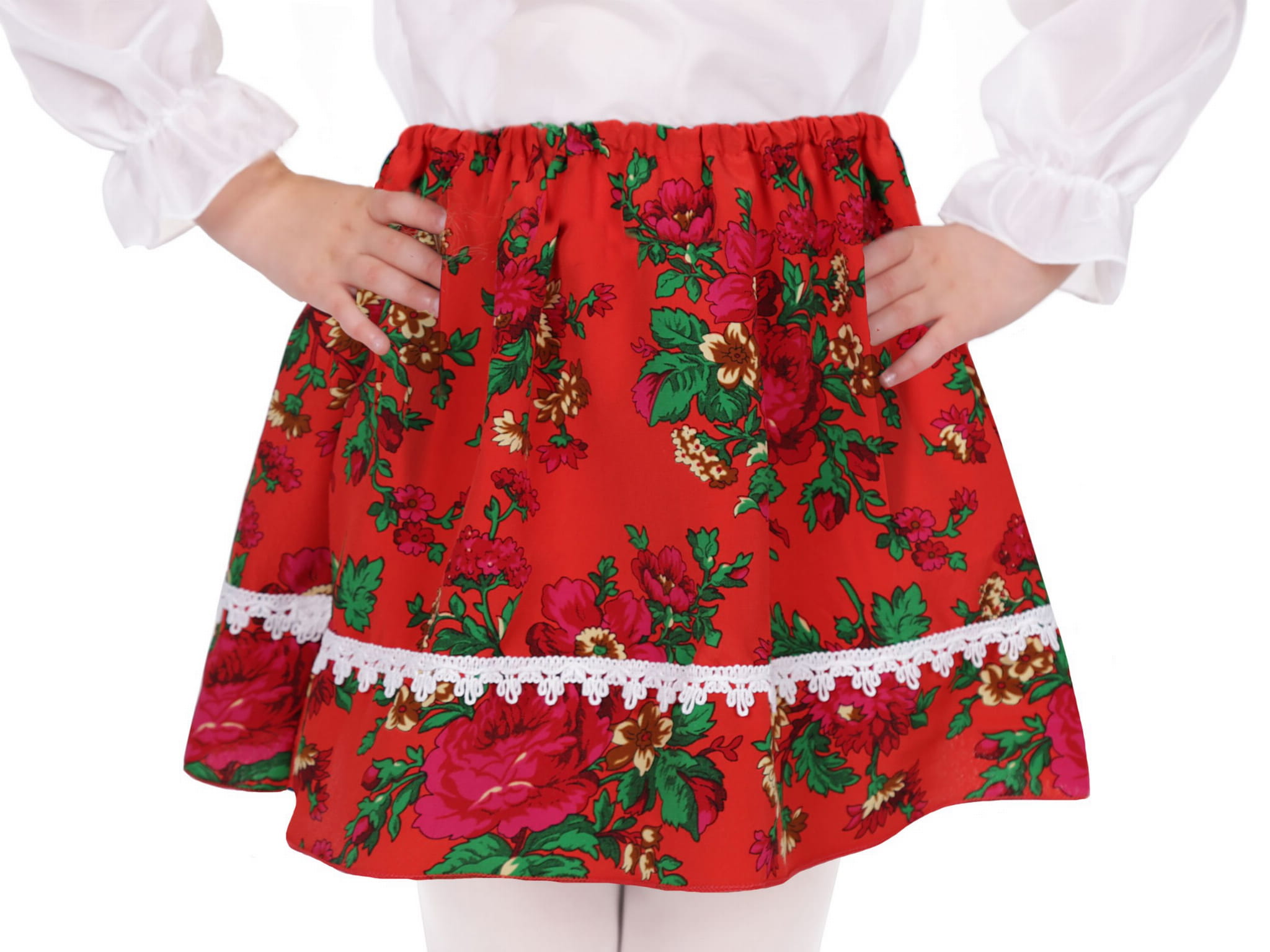 Prosta czerwona spódniczka z wszytą w pasie gumeczką, ozdobiona barwnymi kwiatami oraz białym, eleganckim paseczkiem na dole sprawdzi się doskonale jako dodatek do strojów ludowych, na przykład krakowianki! Na naszych aukcjach znajdziesz także wiele innych dodatków do kostiumów ludowych, a także pełne zestawy Krakowianki, Łowiczanki, Góralki i wiele innych przebrań!