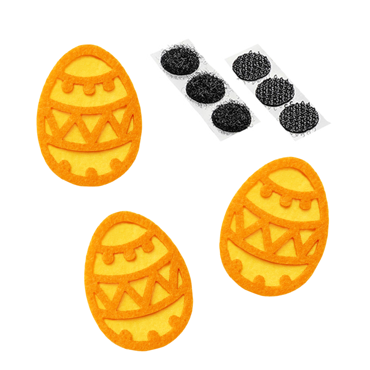 Na spódniczce znajdują się filcowe pisanki w kolorze pomarańczowo-żółtym, które nadają jej radosnego, wielkanocnego charakteru. Do zestawu dołączone są samoprzylepne rzepy typu haczyk i pętelka służące do zamocowania emblematu na spódniczce.
