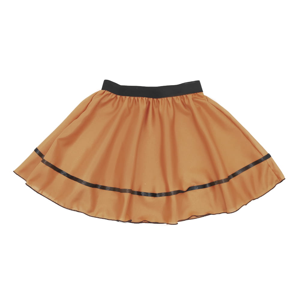 Rozkloszowana spódniczka w kolorze zgaszonego pomarańczu i ozdobiona czarną tasiemką sprawdzi się idealnie jako dodatek do stroju dyni, marchewki, jesieni lub wielu innych kostiumów! Spódniczka posiada wszytą gumeczkę, dzięki czemu łatwiej ją dopasować!